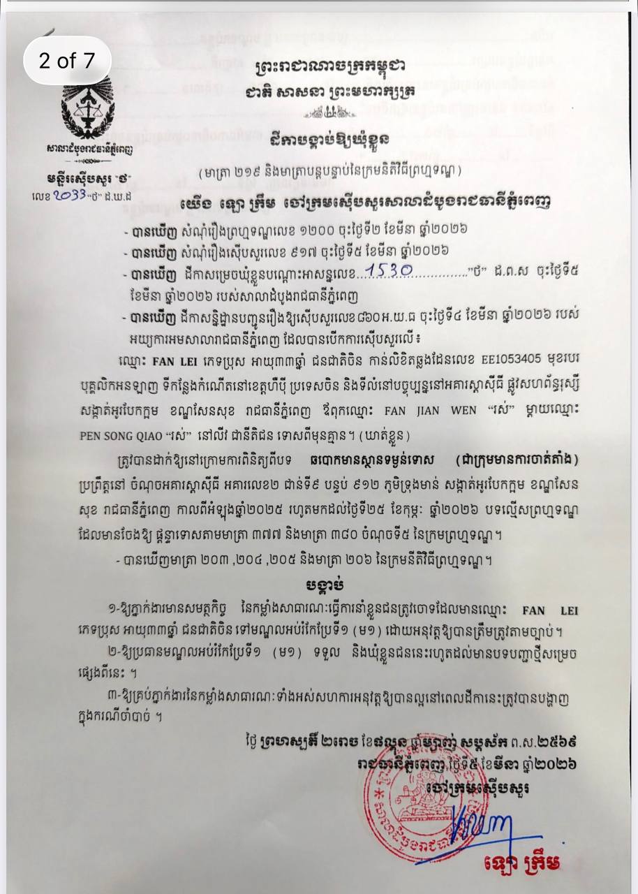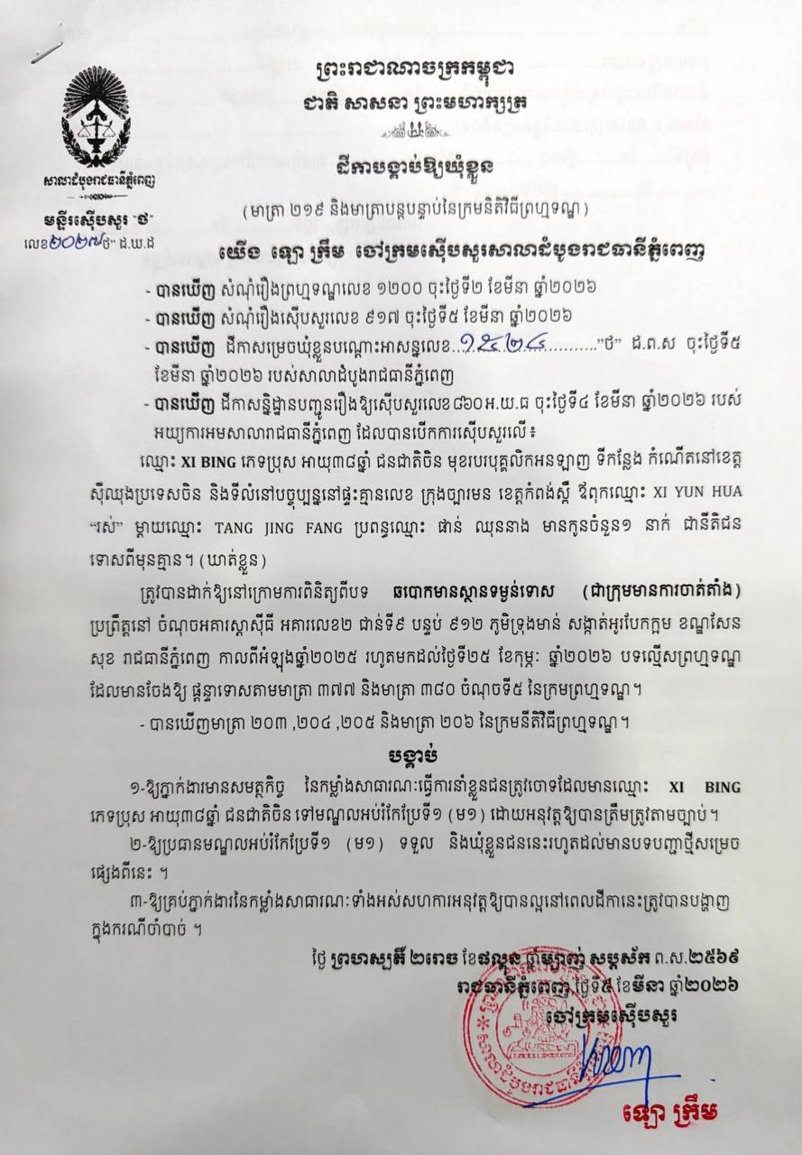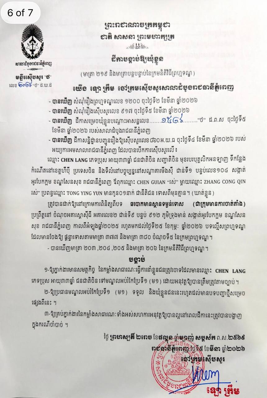 (ភ្នំពេញ)៖ ក្រុមជនត្រូវចោទជាមេខ្លោងចំនួន៧នាក់ ត្រូវបានបញ្ជូនទៅឃុំខ្លួនជាបណ្តោះអាសន្ននៅមណ្ឌលអប់រំកែប្រែទី១ (គុកព្រៃស) កាលពីថ្ងៃទី៥ ខែមីនា ឆ្នាំ២០២៦ ក្រោមបទល្មើសឆបោកមានស្ថានទម្ងន់ទោស ដែលប្រព្រឹត្តនៅអគារស្តាស៊ីធី អគារលេខ២ ជាន់ទី៩ បន្ទប់៩១២ ភូមិទ្រុងមាន់ សង្កាត់អូរបែកក្អម ខណ្ឌសែនសុខ រាជធានីភ្នំពេញ កាលពីអំឡុងឆ្នាំ២០២៥ រហូតមកដល់ថ្ងៃទី២៥ ខែកុម្ភៈ ឆ្នាំ២០២៦។