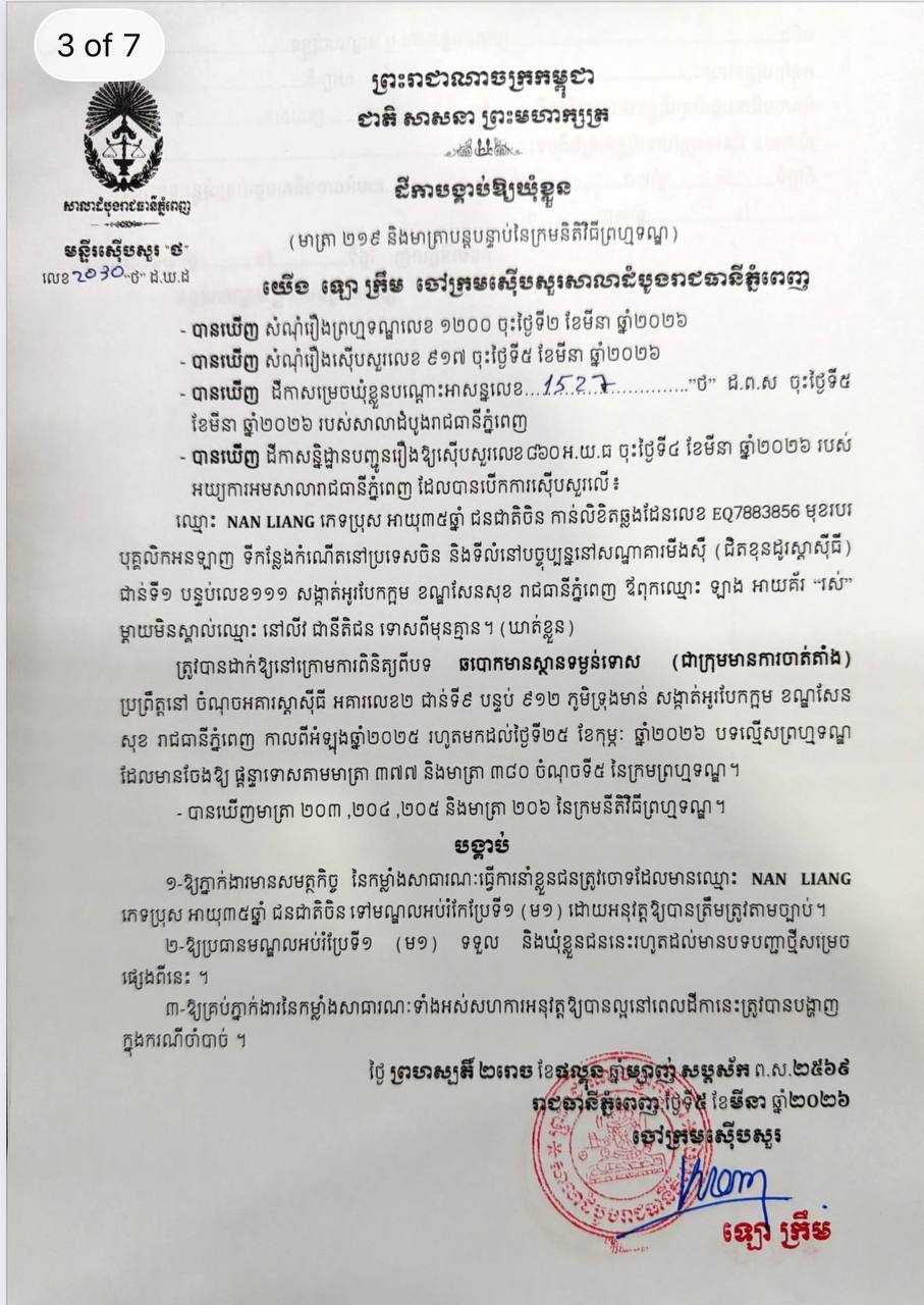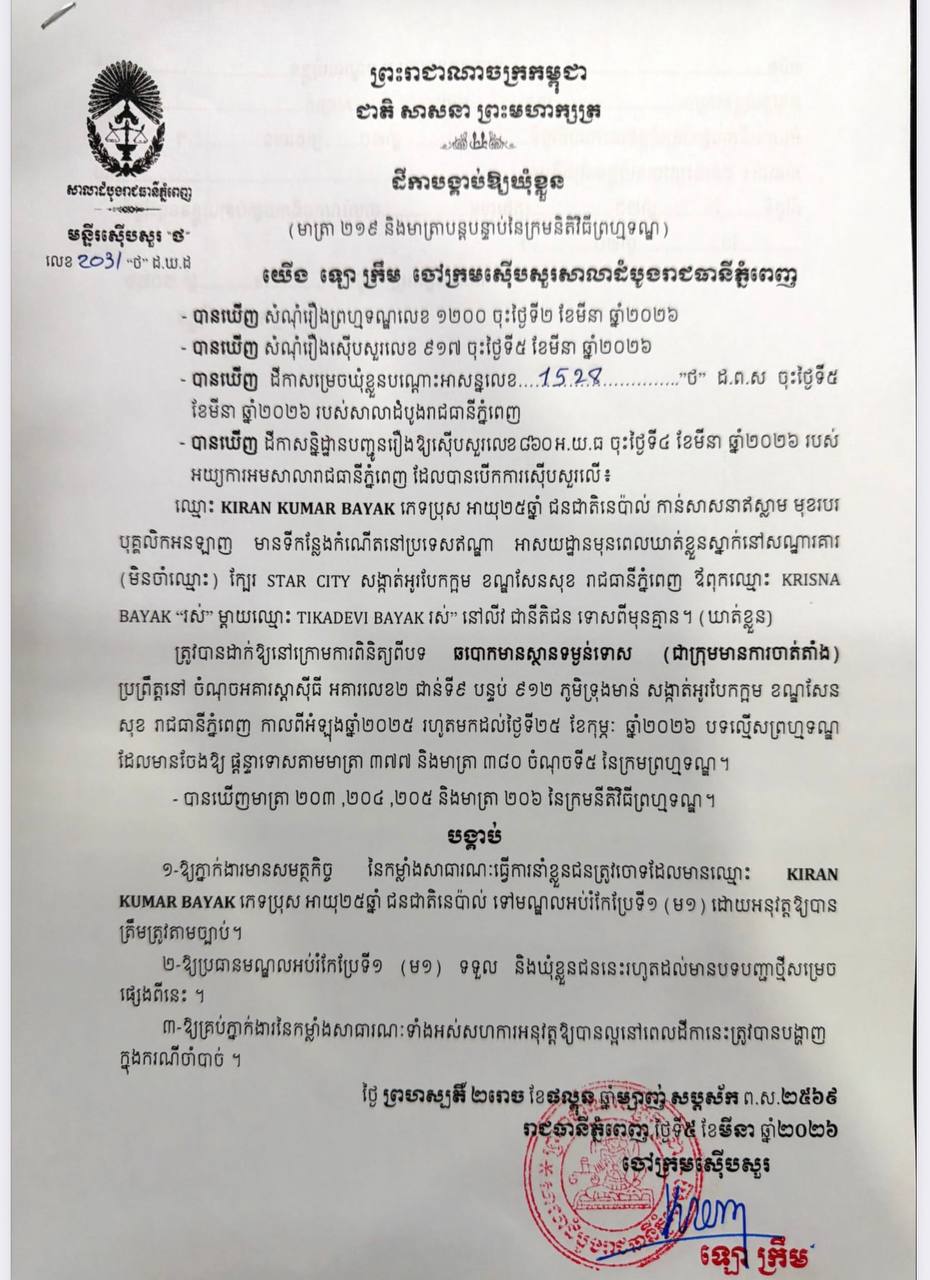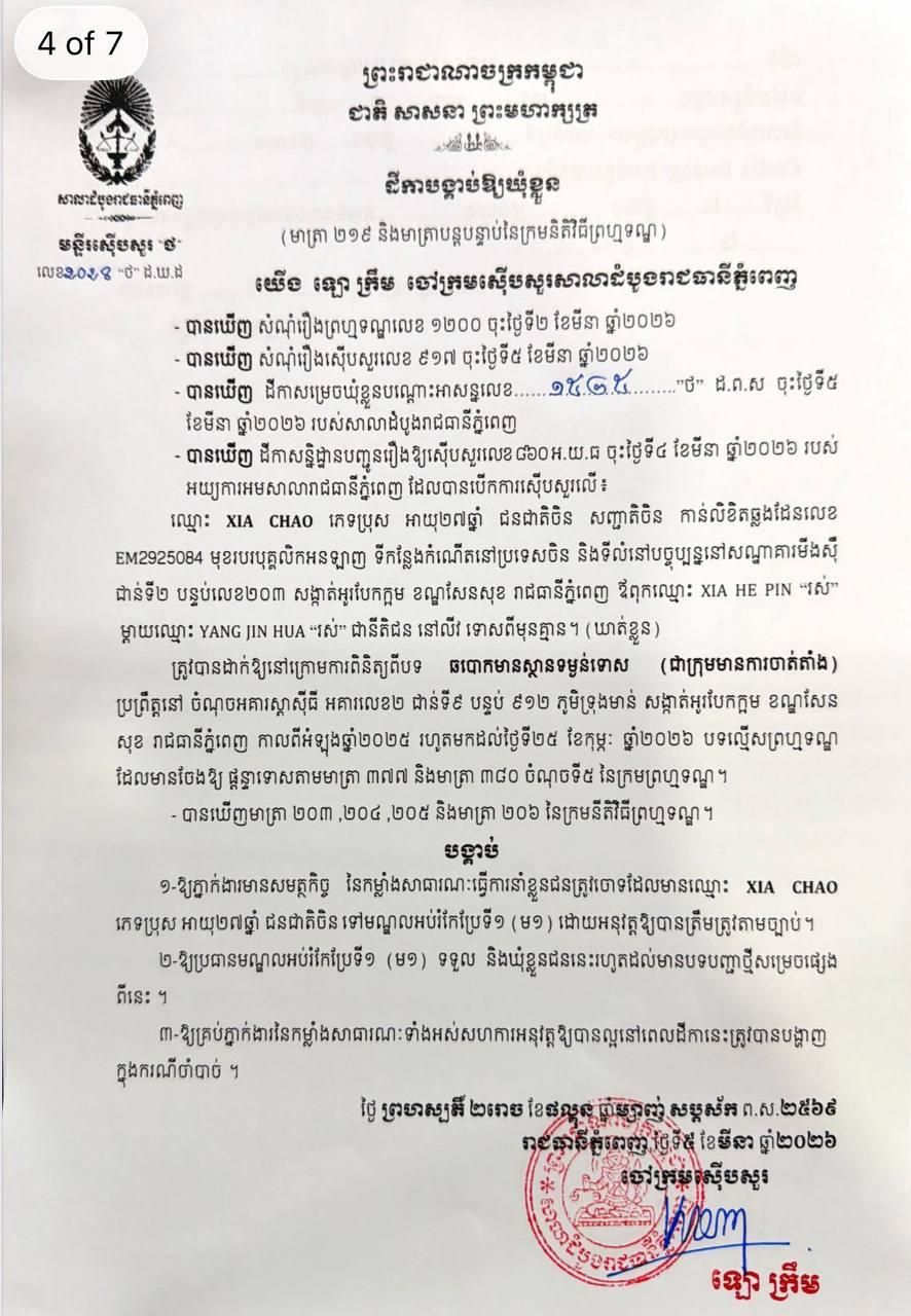 (ភ្នំពេញ)៖ ក្រុមជនត្រូវចោទជាមេខ្លោងចំនួន៧នាក់ ត្រូវបានបញ្ជូនទៅឃុំខ្លួនជាបណ្តោះអាសន្ននៅមណ្ឌលអប់រំកែប្រែទី១ (គុកព្រៃស) កាលពីថ្ងៃទី៥ ខែមីនា ឆ្នាំ២០២៦ ក្រោមបទល្មើសឆបោកមានស្ថានទម្ងន់ទោស ដែលប្រព្រឹត្តនៅអគារស្តាស៊ីធី អគារលេខ២ ជាន់ទី៩ បន្ទប់៩១២ ភូមិទ្រុងមាន់ សង្កាត់អូរបែកក្អម ខណ្ឌសែនសុខ រាជធានីភ្នំពេញ កាលពីអំឡុងឆ្នាំ២០២៥ រហូតមកដល់ថ្ងៃទី២៥ ខែកុម្ភៈ ឆ្នាំ២០២៦។