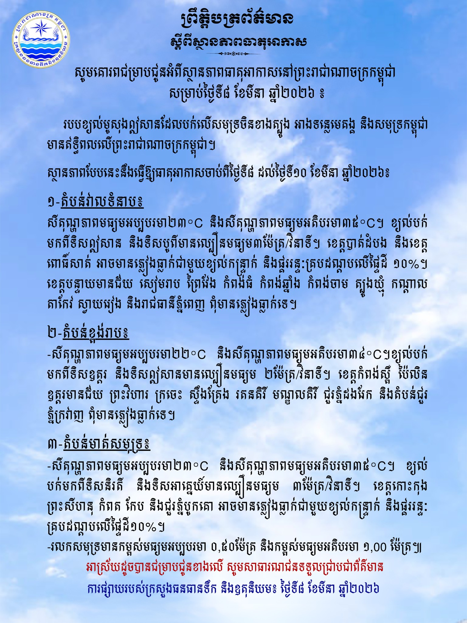 ក្រសួងធនធានទឹក ជូនដំណឹងអំពីស្ថានភាពធាតុអាកាសនៅកម្ពុជា សម្រាប់ថ្ងៃទី៨ ខែមីនា ឆ្នាំ២០២៦