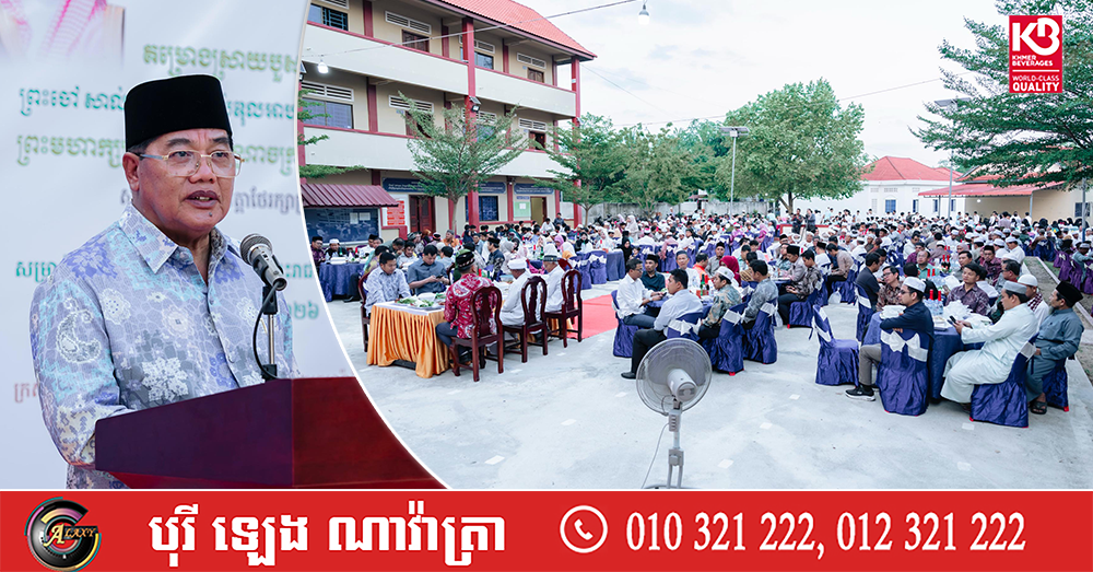 (កំពង់ឆ្នាំង)៖ នៅល្ងាចថ្ងៃទី៧ ខែមីនា ឆ្នាំ២០២៦ លោកបណ្ឌិត អូស្មាន ហាស្សាន់ ទេសរដ្ឋមន្ត្រីទទួលបន្ទុកបេសកកម្មពិសេស អញ្ជើញជាអធិបតីក្នុងពិធីពិសាអាហារស្រាយបួសខែរ៉ម៉ាឌន ជាមួយសាសនិកឥស្លាមខេត្តកំពង់ឆ្នាំង ចំនួន១,២០០នាក់ នៅបរិវេណវិទ្យាល័យអាពូប៉ាកេីរឥស្លាមកម្ពុជា ស្ថិតនៅភូមិច្រករមៀត ឃុំឈូកស ស្រុកកំពង់ត្រឡាច ខេត្តកំពង់ឆ្នាំង។