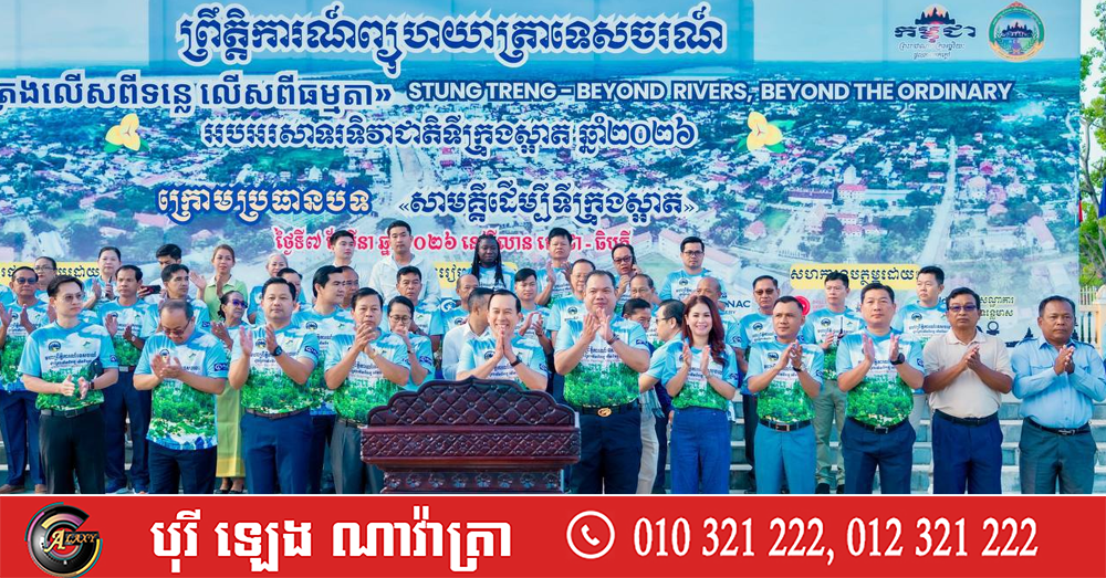 (ភ្នំពេញ)៖ លោក ហួត ហាក់ រដ្ឋមន្ត្រីក្រសួងទេសចរណ៍ រួមជាមួយលោក សរ សុពុត្រា អភិបាលនៃគណៈអភិបាលខេត្តស្ទឹងត្រែង អញ្ជើញជាអធិបតីក្នុងពិធីបើកព្រឹត្តិការណ៍ព្យុហយាត្រាទេសចរណ៍ ចម្ងាយ ៣,៥ គីឡូម៉ែត្រ ដើម្បីអបអរសាទរទិវាជាតិទីក្រុងស្អាត ឆ្នាំ២០២៦ ជាមួយនឹងការប្រកាសដាក់ឱ្យអនុវត្តជាផ្លូវការ «ផែនការអភិវឌ្ឍន៍ទេសចរណ៍ខេត្តស្ទឹងត្រែងឆ្នាំ២០២៦-២០៣០ » និងការដាក់ចេញប្រេនឌីងថ្មី «ស្ទឹងត្រែងលើសពីទន្លេ លើសពីធម្មតា» ក្រោមបរិយាកាសដ៏អធិកអធមក្រៃលែង។