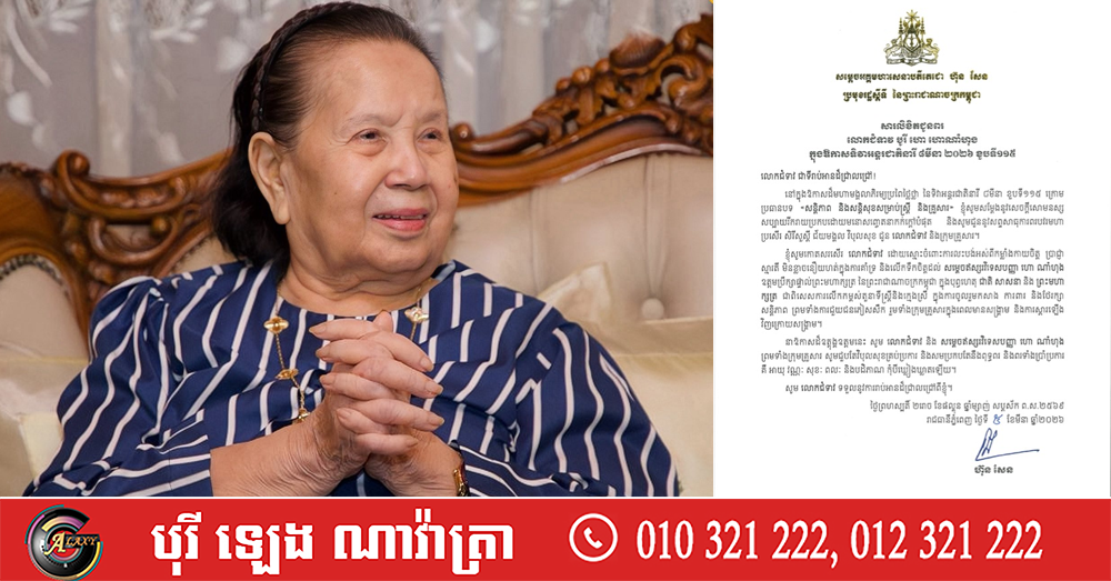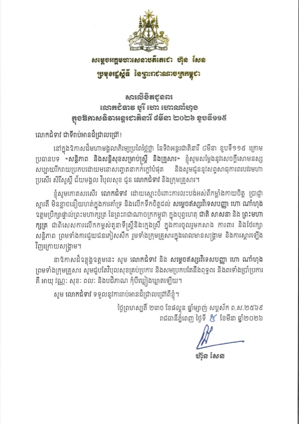 សម្តេចតេជោ ហ៊ុន សែន ប្រមុខរដ្ឋស្តីទី ផ្ញើសារលិខិតជូនពរ លោកជំទាវ បូរី ហោ ហោណាំហុង ក្នុងឱកាសប្រារព្ធខួបលើកទី ១១៥ ទិវាអន្តរជាតិនារី ៨មីនា ឆ្នាំ២០២៦
