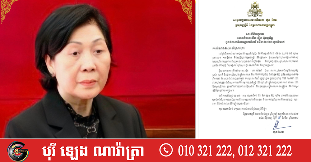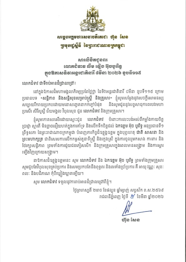 សម្តេចតេជោ ហ៊ុន សែន ប្រមុខរដ្ឋស្តីទី ផ្ញើសារលិខិតជូនពរ លោកជំទាវ លឹម ទៀង អ៊ុចបូររិទ្ធ ក្នុងឱកាសប្រារព្ធខួបលើកទី ១១៥ ទិវាអន្តរជាតិនារី ៨មីនា ឆ្នាំ២០២៦