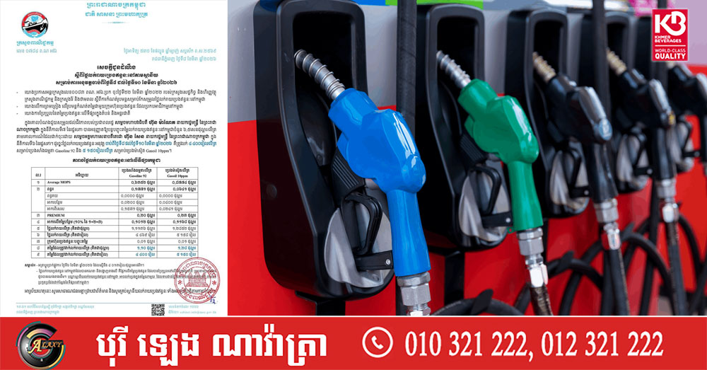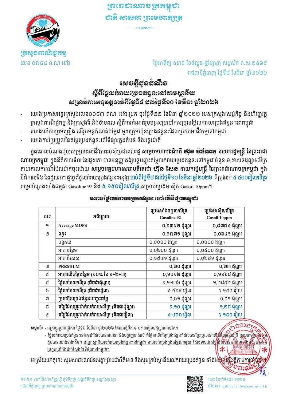 (ភ្នំពេញ)៖ ក្រសួងពាណិជ្ជកម្ម ចេញប្រកាសអំពីតម្លៃប្រេងកើនឡើង សម្រាប់ថ្ងៃទី៨ ដល់ទី១០ ខែមីនា ឆ្នាំ២០២៦។