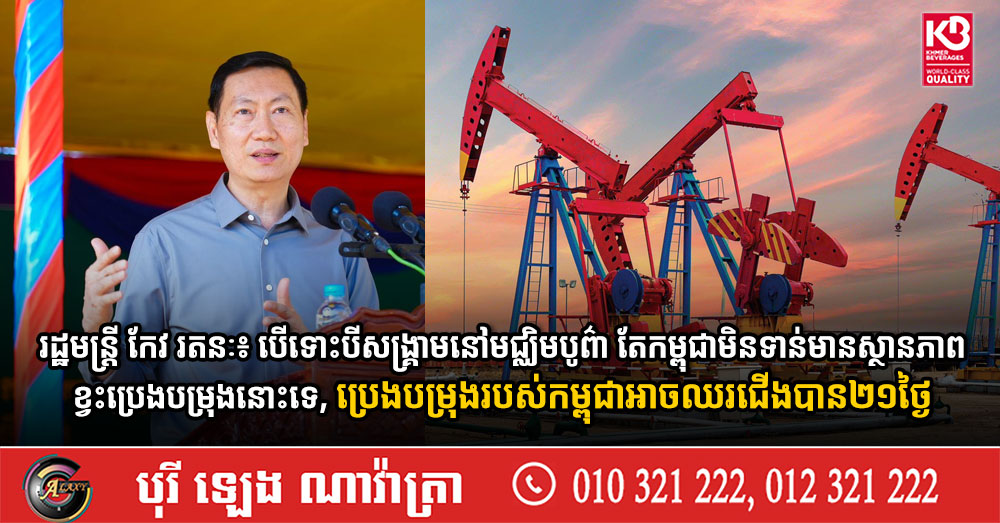 រដ្ឋមន្រ្តី កែវ រតនៈ៖ បើទោះបីសង្គ្រាមនៅមជ្ឈិមបូព៌ា តែកម្ពុជាមិនទាន់មានស្ថានភាពខ្វះប្រេងបម្រុងនោះទេ, ប្រេងបម្រុងរបស់កម្ពុជាអាចឈរជើងបាន២១ថ្ងៃ (Video inside)