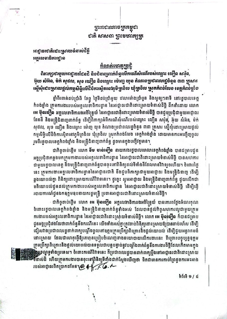 លុះនៅអំឡុងខែធ្នូ ឆ្នាំ២០១៩ ក្រុមការងារអាជ្ញាធរជាតិដោះស្រាយទំនាស់ដីធ្លី បានសហការជាមួយរដ្ឋបាលខេត្តកំពង់ឆ្នាំង រដ្ឋបាលស្រុកកំពង់លែង រួមនឹងមន្ត្រីជំនាញពាក់ព័ន្ធ ចុះធ្វើការពិនិត្យទៅលើដីទំហំជាង៨០ហិកតា ដែលប្រជាពលរដ្ឋស្នើសុំឲ្យពិនិត្យ និងដោះស្រាយ។