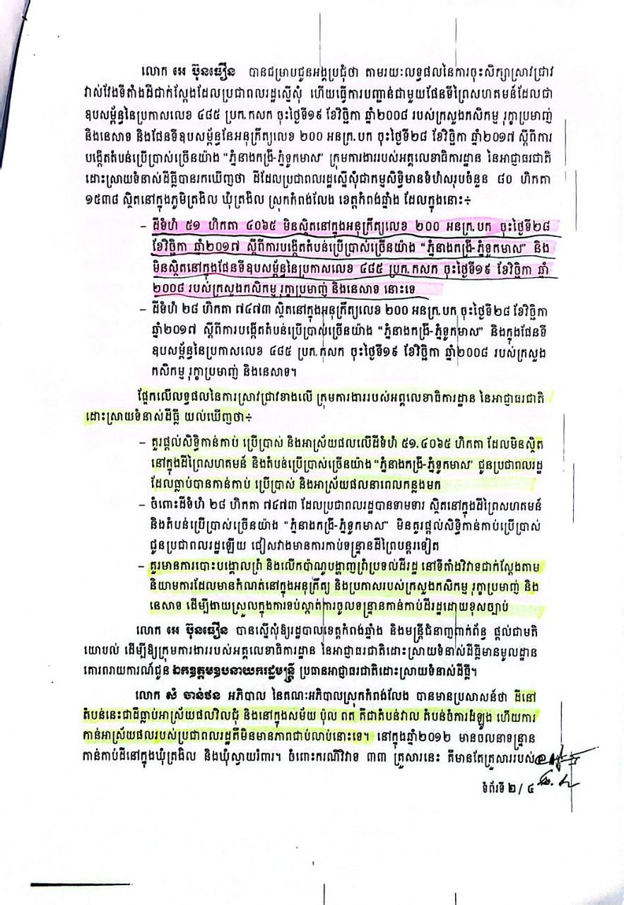 ជាលទ្ធផលការចុះពិនិត្យដោះស្រាយរបស់អាជ្ញាធរជាតិដោះស្រាយទំនាស់ដីធ្លី បានបញ្ជាក់ថា ក្នុងដីទំហំ៨០.១៥ ៣៨ហិកតា ស្ថិតក្នុងភូមិត្រងិល ឃុំត្រងិល ស្រុកកំពង់លែង ខេត្តកំពង់ឆ្នាំង ដែលពលរដ្ឋស្នើសុំឲ្យដោះស្រាយ ក្នុងនោះដីទំហំ ៥១.៤០៦៥ហិកតា មិនស្ថិតនៅក្នុងអនុក្រឹត្យលេខ២០០ អនក្រ.បក ចុះថ្ងៃទី២៨ ខែវិច្ឆិកា ឆ្នាំ២០១៧ ស្ដីពីការបង្កើតតំបន់ប្រើប្រាស់ច្រើនយ៉ាង «ភ្នំនាងកង្រី-ភ្នំទូកមាស» និងមិនស្ថិតក្នុងផែនទីដីសហគមន៍ព្រៃឈើ ឧបសម្ព័ន្ធនៃប្រកាសលេខ៤៨៥ប្រក.កសក ចុះថ្ងៃទី១៩ ខែវិច្ឆិកា ឆ្នាំ២០០៨ របស់ក្រសួងកសិកម្ម រុក្ខាប្រមាញ់ និងនេសាទនោះទេ។