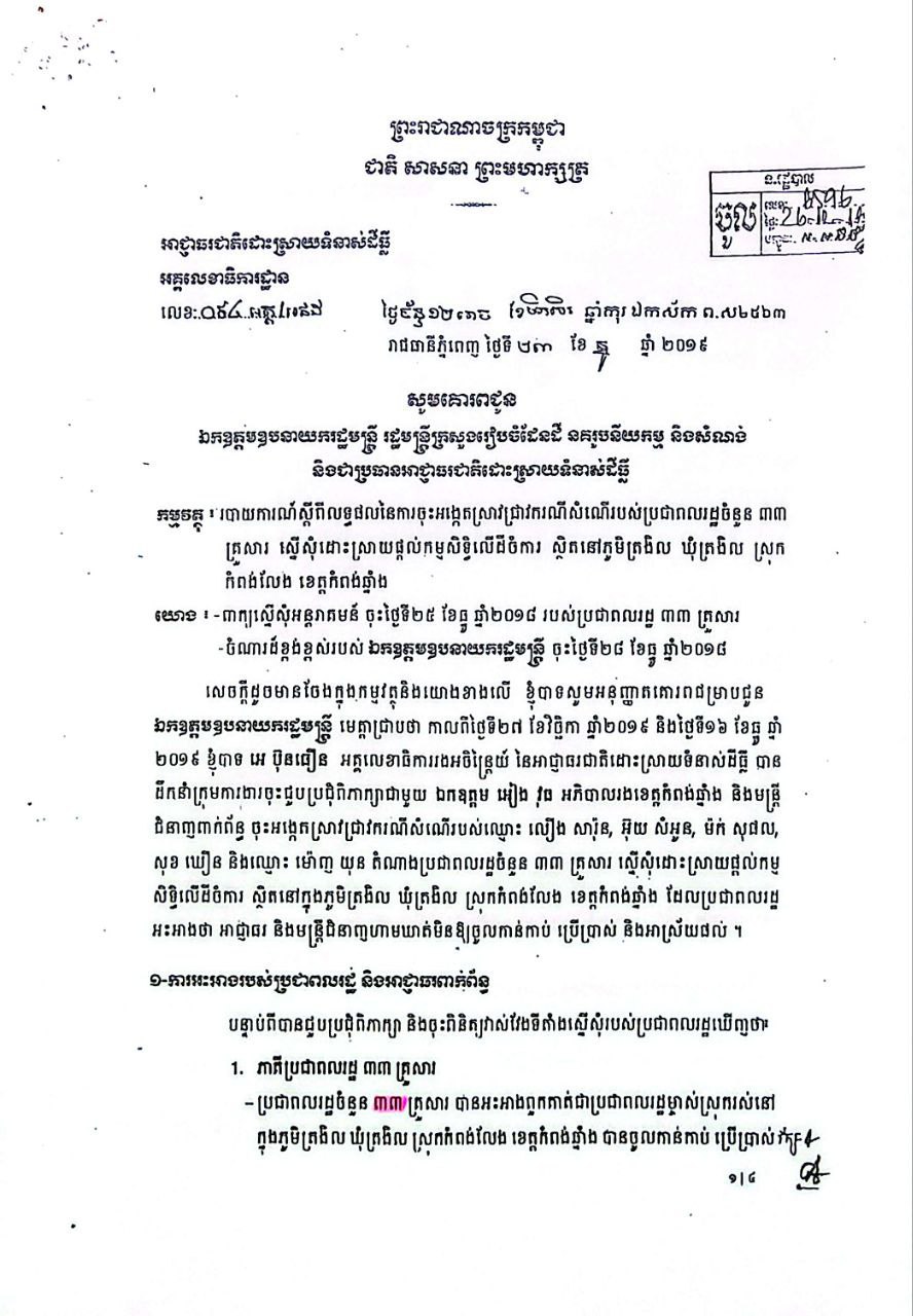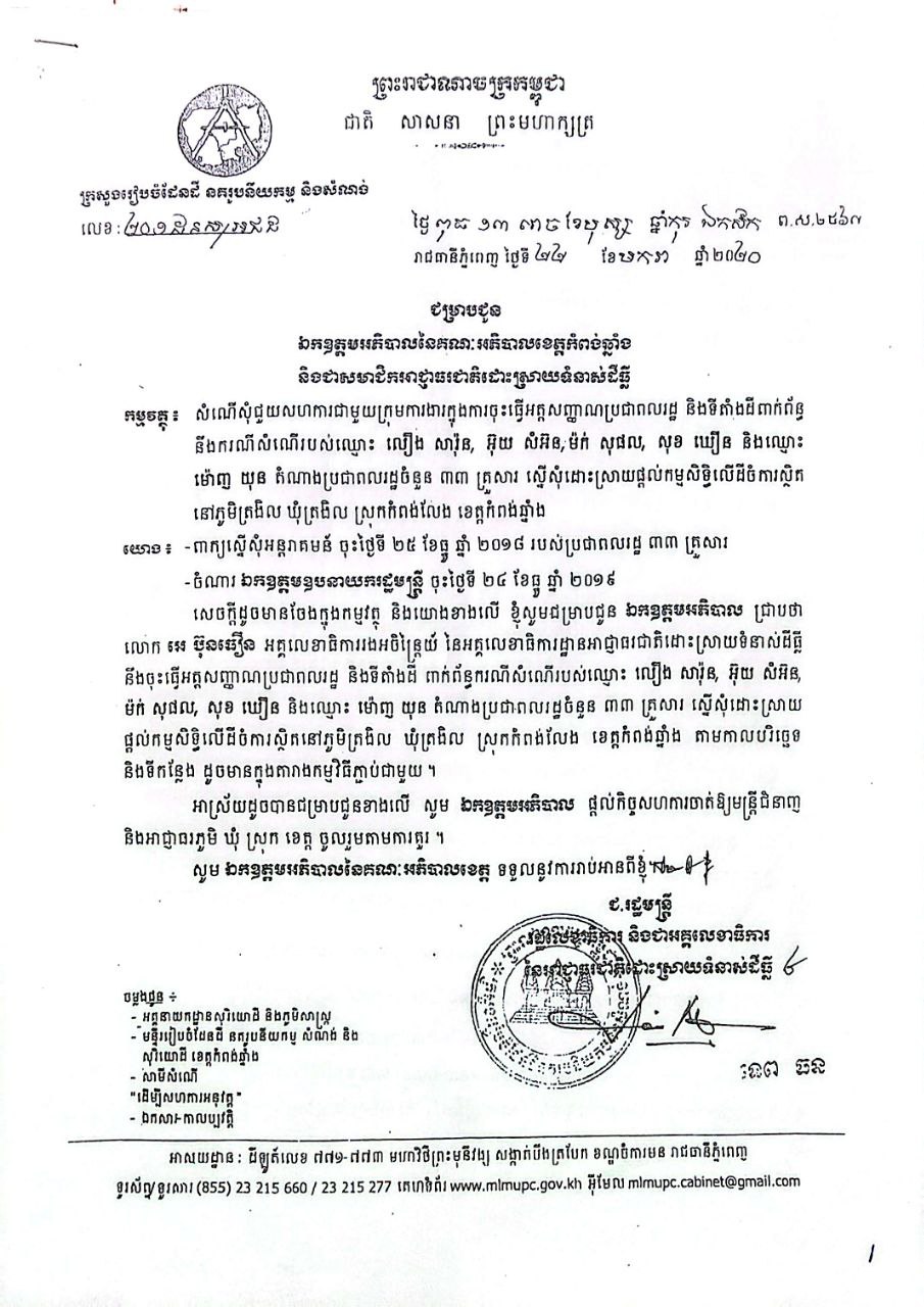 បន្ទាប់ពីមានការហាមឃាត់ពីអាជ្ញាធរ និងមន្ត្រីពាក់ព័ន្ធ ពួកគាត់ចំនួន៤៧គ្រួសារ ក៏បានដាក់លិខិតស្នើសុំកិច្ចអន្តរាគមន៍ពីលោកឧបនាយករដ្ឋមន្ត្រី និងជារដ្ឋមន្ត្រី ក្រសួងរៀបចំដែនដី នគររូបនីយកម្ម និងសំណង់ សុំជួយធ្វើការចុះពិនិត្យ និងដោះស្រាយជូនពួកគាត់។