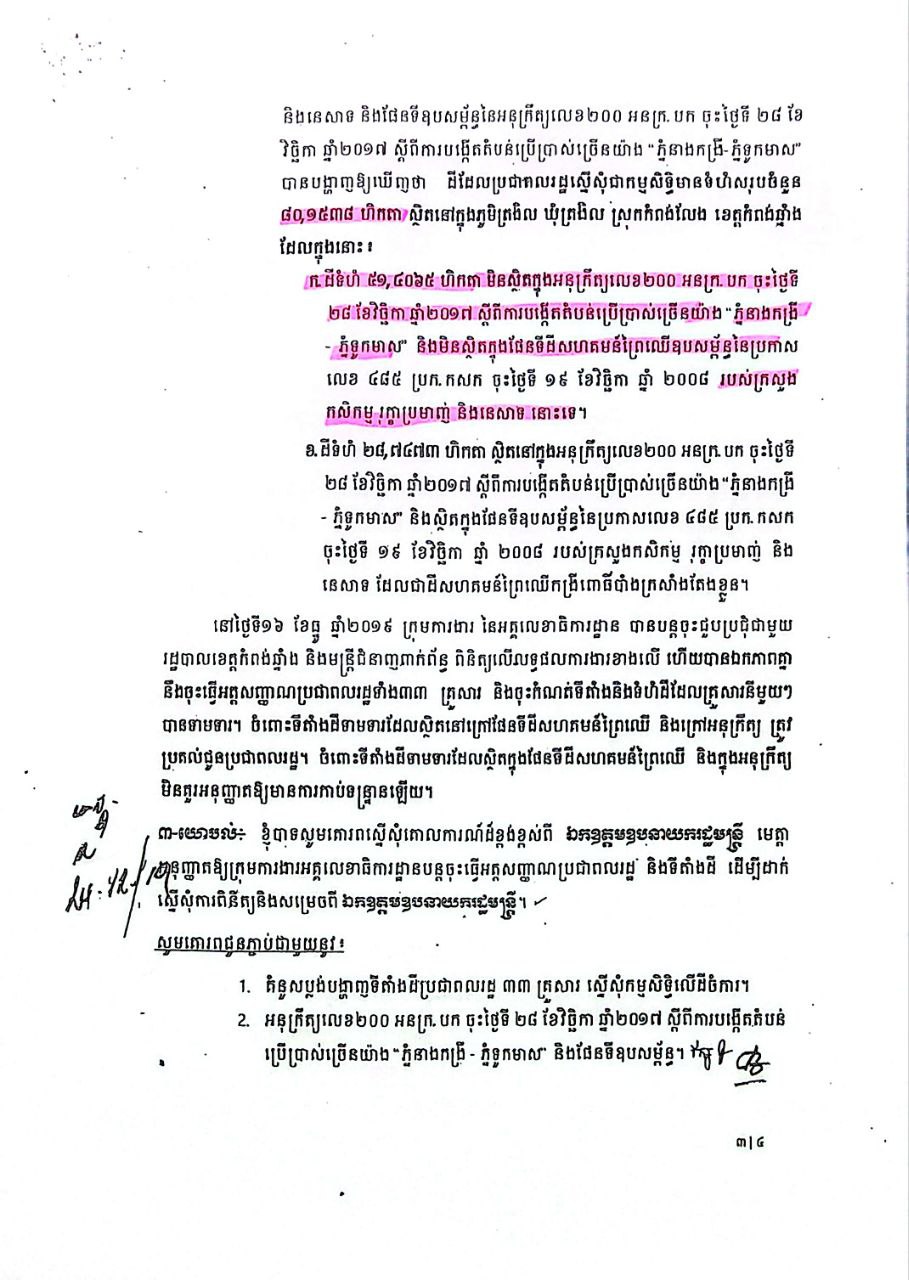 ចំណែកដីទំហំ ២៨.៧៤៧៣ហិកតា ក្នុងចំណោមដីជាង៨០ហិកតាខាងលើនេះ គឺស្ថិតនៅក្នុងអនុក្រឹត្យលេខ២០០អនក្រ.បកចុះថ្ងៃទី២៨ ខែវិច្ឆិកា ឆ្នាំ២០១៧ ស្ដីពីការបង្កើតតំបន់ប្រើប្រាស់ច្រើនយ៉ាង «ភ្នំនាងកង្រី-ភ្នំទូកមាស»។ ពួកគាត់បានបញ្ជាក់ទៀតថា ដីទំហំ ៥១.៤០៦៥ ដែលអាជ្ញាធរជាតិដោះស្រាយទំនាស់ដីធ្លីរកមិនឃើញជាប់ពាក់ព័ន្ធដីរបស់រដ្ឋ ក្រសួងរៀបចំដែនដី និងអាជ្ញាធរ រួមទាំងមន្ត្រីជំនាញពាក់ព័ន្ធ ក៏បានប្រគល់មកឲ្យពលរដ្ឋជាច្រើនគ្រួសារ រស់នៅក្នុងភូមិត្រងិល ឃុំត្រងិល ស្រុកកំពង់លែង កាន់កាប់ និងអាស្រ័យផលវិញនៅអំឡុងឆ្នាំ២០១៩នោះផងដែរ។