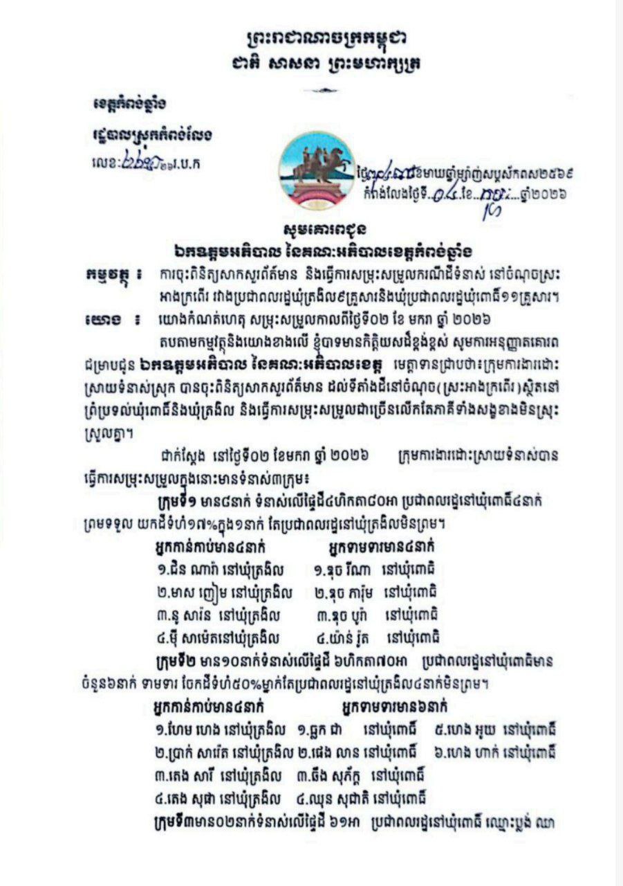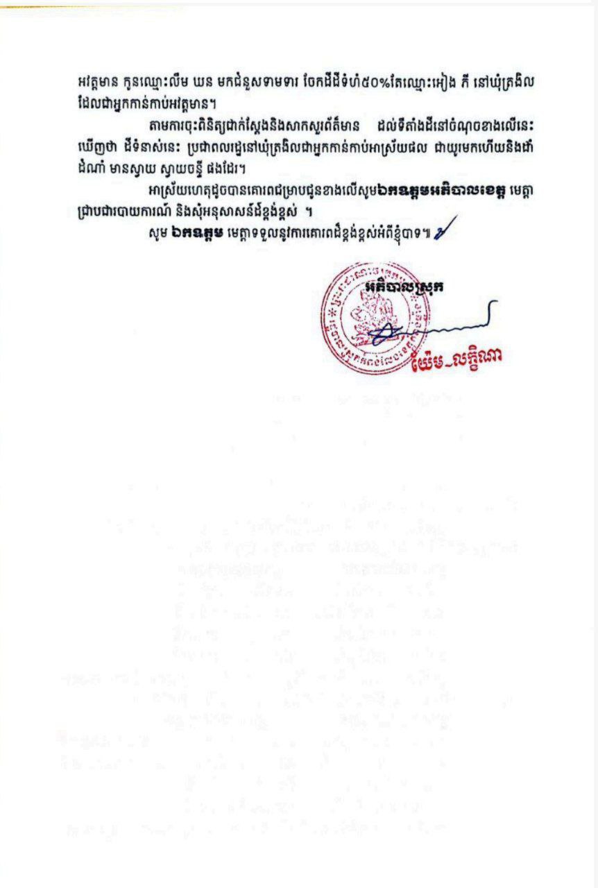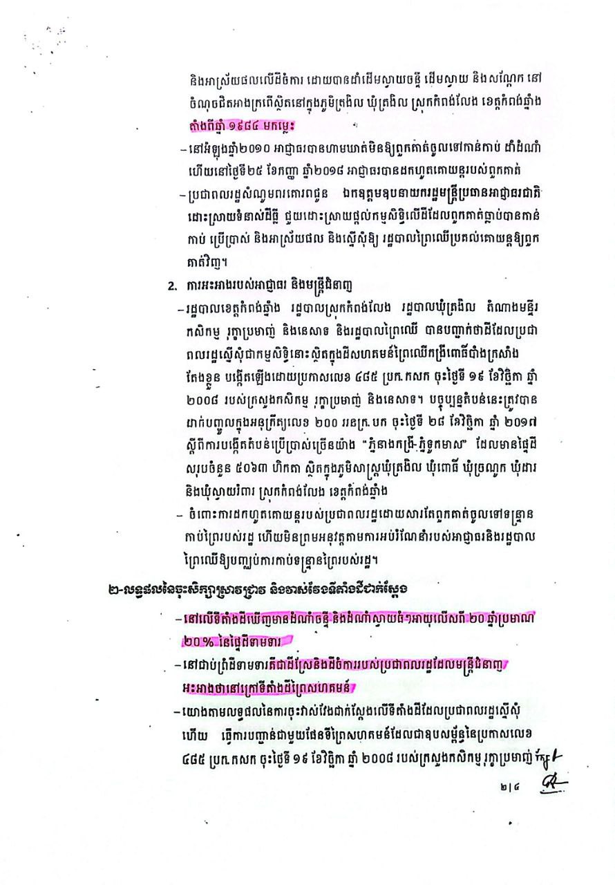 ក្នុងរបាយការណ៍របស់លោកអភិបាលស្រុកកំពង់លែង ចុះថ្ងៃទី៤ ខែកុម្ភៈ ឆ្នាំ២០២៦ បានបញ្ជាក់ថា តាមការចុះពិនិត្យជាក់ស្ដែង និងសាកសួរព័ត៌មានដល់ទីតាំងដីនៅចំណុចខាងលើនេះឃើញថា ដីទំនាស់នេះប្រជាពលរដ្ឋនៅក្នុងភូមិត្រងិល ឃុំត្រងិល ស្រុកកំពង់លែង ជាអ្នកកាន់កាប់ និងអាស្រ័យផលជាយូរមកហើយ និងមានដាំដំណាំដើមស្វាយ និងដើមស្វាយចន្ទីធំៗទៀតផង ក្នុងនោះពលរដ្ឋក្នុងឃុំត្រងិលមួយចំនួនមានទាំងលិខិត កាន់កាប់ដីធ្លីពីអាជ្ញាធរភូមិ-ឃុំនិងការិយាល័យភូមិបាលស្រុកទៀតផង។