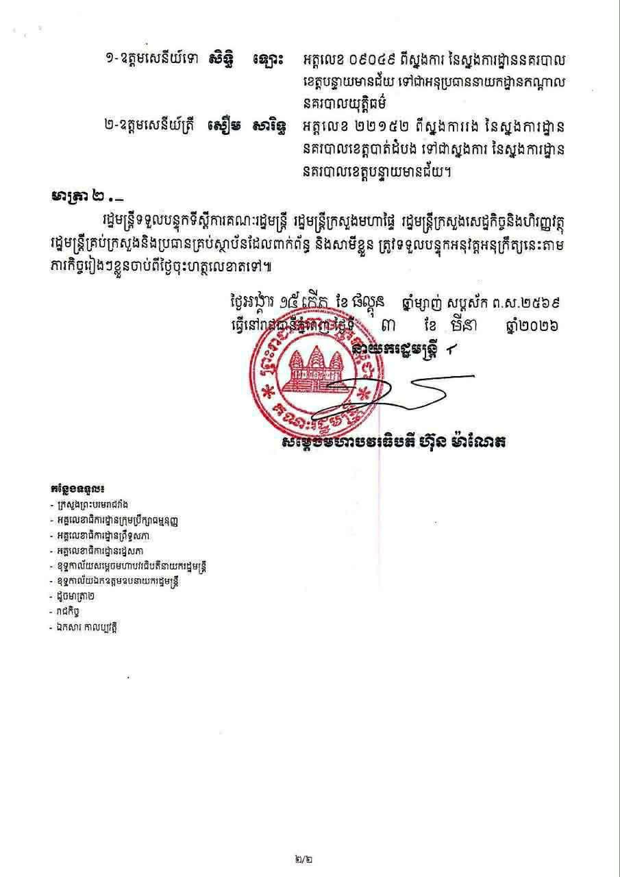 (ភ្នំពេញ)៖ សម្ដេចមហាបវរធិបតី ហ៊ុន ម៉ាណែត នាយករដ្ឋមន្ដ្រីនៃកម្ពុជា បានចេញអនុក្រឹត្យតែងតាំង និងផ្លាស់ប្ដូរស្នងការ នៃស្នងការដ្ឋាននគរបាលខេត្តបន្ទាយមានជ័យ ដោយលោកឧត្តមសេនីយ៍ត្រី សឿម សារិទ្ធ ជំនួសលោកឧត្តមសេនីយ៍ទោ សិទ្ធិ ឡោះ។ នេះបើតាមអនុក្រឹត្យដែលបណ្ដាញព័ត៌មាន Fresh News ទទួលបាននៅថ្ងៃទី៩ ខែមីនា ឆ្នាំ២០២៦។