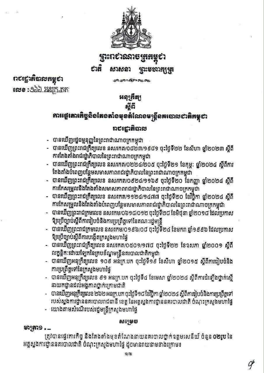 ក្នុងអនុក្រឹត្យនោះ លោកឧត្តមសេនីយ៍ទោ សិទ្ធិ ឡោះ ត្រូវបានតែងតាំងជាអនុប្រធាននាយកដ្ឋានកណ្ដាលនគរបាលយុត្តិធម៌ នៃអគ្គស្នងការដ្ឋាននគរបាលជាតិ។ ដោយឡែក លោកឧត្តមសេនីយ៍ត្រី សឿម សារិទ្ធ មុនត្រូវបានតែងតាំងជាស្នងការ លោកមានតួនាទីជាស្នងការរង នៃស្នងការដ្ឋាននគរបាលខេត្តបាត់ដំបង។