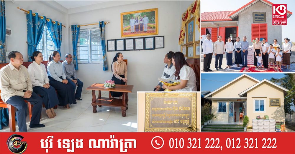 (កំពង់ឆ្នាំង)៖ លោកជំទាវបណ្ឌិត ពេជ ចន្ទមុន្នី ហ៊ុនម៉ាណែត ស្ត្រីទី១របស់កម្ពុជា នាព្រឹកថ្ងៃទី០៩ ខែមីនា ឆ្នាំ២០២៦នេះ បានអញ្ជើញជាវត្តមានដ៏ខ្ពង់ខ្ពស់ប្រគល់ផ្ទះថ្មី ជូនក្រុមគ្រួសាររបស់វីរកងទ័ពពលី ដែលរស់នៅក្នុងមូលដ្ឋានខេត្តកំពង់ឆ្នាំង ដើម្បីជាការតបស្នងសងគុណដល់វីរកងទ័ព និងបញ្ជាក់ពីការចងចាំនូវវីរភាពដ៏អង់អាចក្លាហានរបស់វីរកងទ័ព ដែលបានបូជាសាច់ស្រស់ឈាមស្រស់ដើម្បីការពារបូរណភាពទឹកដី។