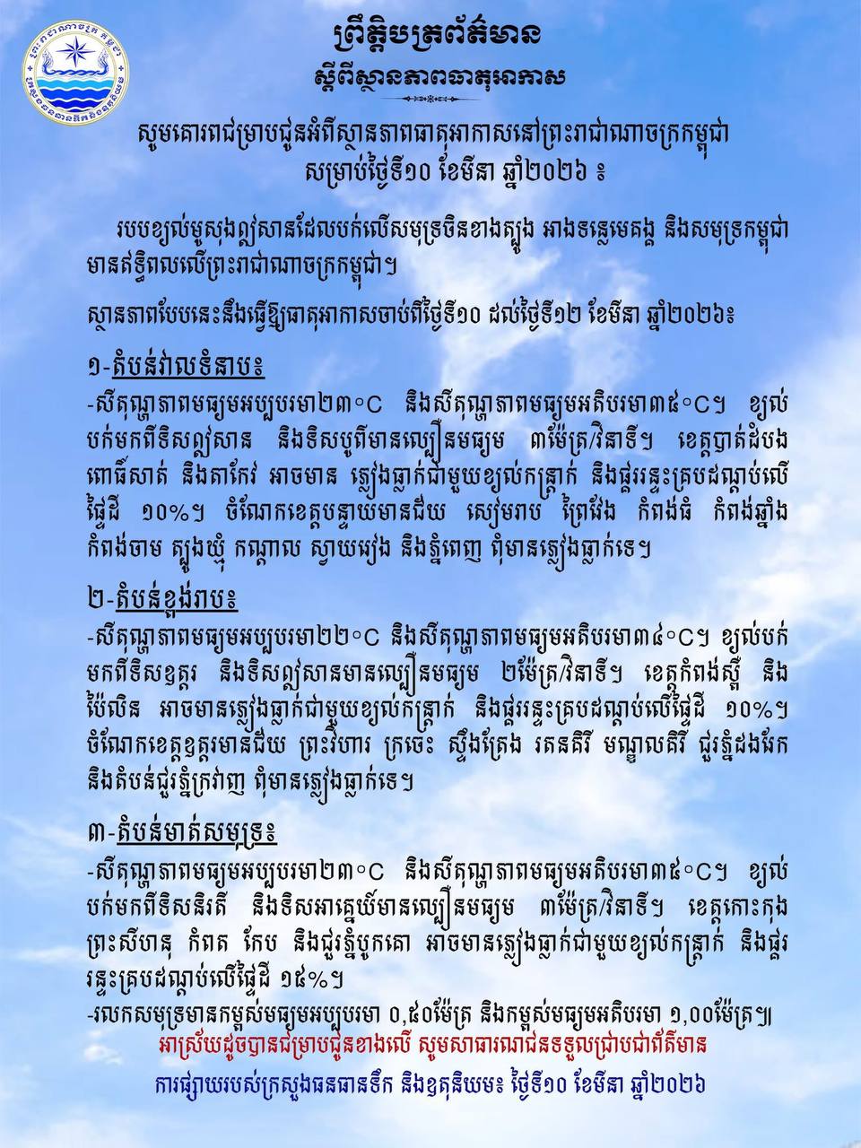 ក្រសួងធនធានទឹក ជូនដំណឹងអំពីស្ថានភាពធាតុអាកាសនៅកម្ពុជា សម្រាប់ថ្ងៃទី៩ ខែមីនា ឆ្នាំ២០២៦