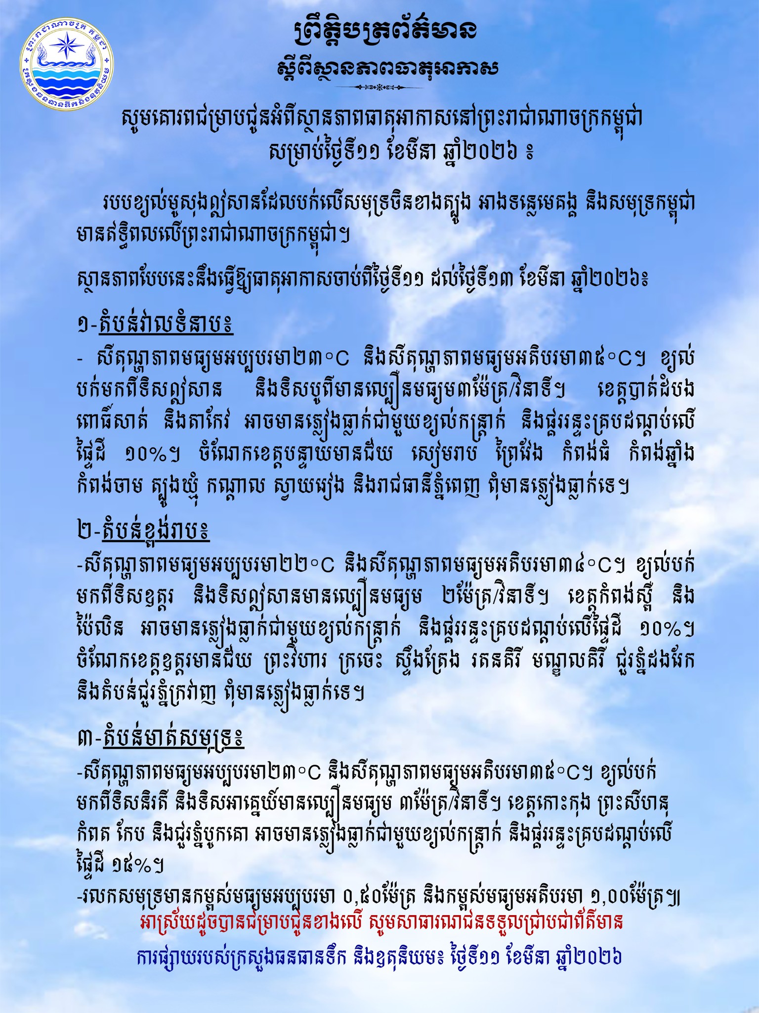 ក្រសួងធនធានទឹក ជូនដំណឹងអំពីស្ថានភាពធាតុអាកាសនៅកម្ពុជា សម្រាប់ថ្ងៃទី១១ ខែមីនា ឆ្នាំ២០២៦