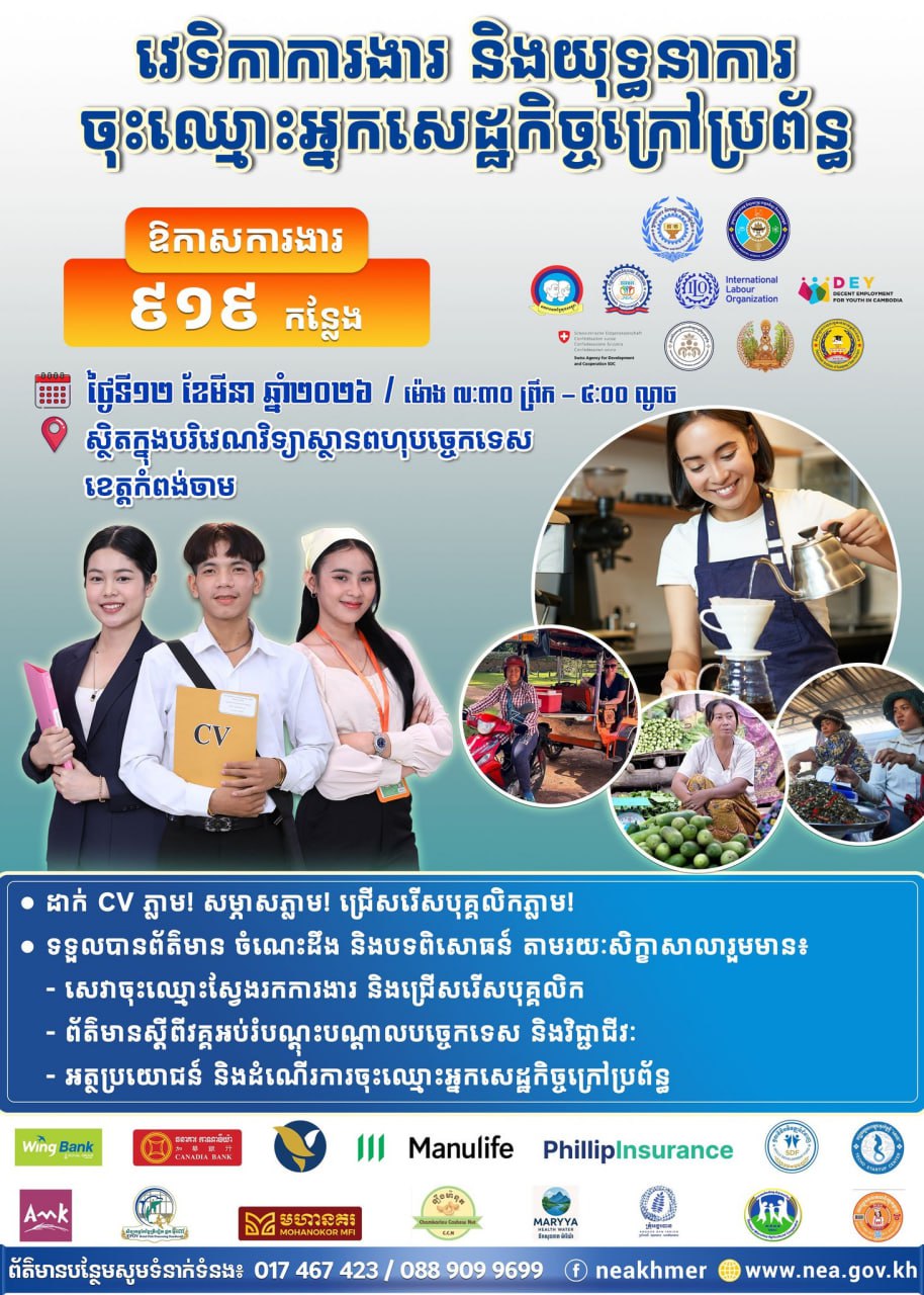 (កំពង់ចាម)៖ ក្រសួងការងារ និងបណ្តុះបណ្តាលវិជ្ជាជីវៈ គ្រោងនាំយកឱកាសការងារសរុបចំនួន ៩១៩កន្លែង តាមរយៈ «វេទិកាការងារ និងយុទ្ធនាការចុះឈ្មោះអ្នកសេដ្ឋកិច្ចក្រៅប្រព័ន្ធ» ទៅកាន់ខេត្ដកំពង់ចាម សម្រាប់អតីតពលករខ្មែរ និងអ្នកកំពុងស្វែងរកការងារ ដែលរៀបចំនៅថ្ងៃទី ១២ ខែមីនា ឆ្នាំ២០២៦ នៅវិទ្យាស្ថានពហុបច្ចេកទេសខេត្តកំពង់ចាម។