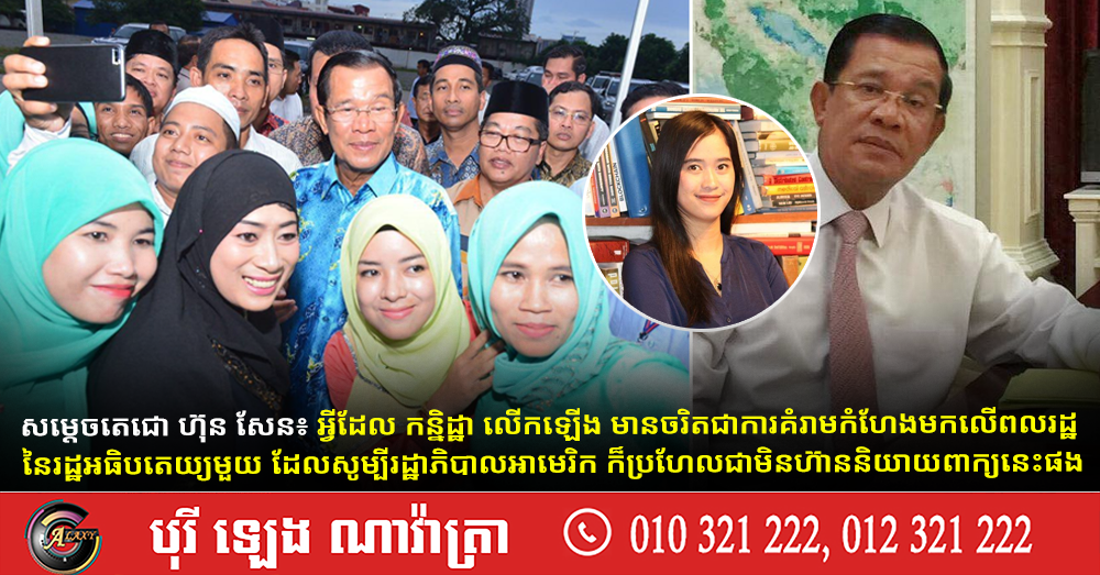 (ភ្នំពេញ)៖ សម្តេចតេជោ ហ៊ុន សែន ប្រមុខរដ្ឋស្តីទី បានចេញសារទប់ស្កាត់ផលប៉ះពាល់ ដែលលើកឡើងដោយ អ្នកនាង កន្និដ្ឋា ដែលថា អាមេរិកអាចមកចាប់បងប្អូនខ្មែរឥស្លាម ដែលកាន់សាសនាបែបអ៉ីរ៉ង់នៅកម្ពុជា។