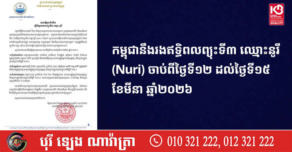 (ភ្នំពេញ)៖ ក្រសួងធនធានទឹក និងឧតុនិយម បានបញ្ជាក់ឱ្យដឹងថា កម្ពុជានឹងរងឥទ្ធិពលព្យុះទី៣ ឈ្មោះនូរី (Nuri) T2603 ចាប់ពីថ្ងៃទី១២ ដល់ថ្ងៃទី១៥ ខែមីនា ឆ្នាំ២០២៦ ដែលនឹងបណ្តាលឱ្យតំបន់ខ្ពង់រាប, តំបន់វាលទំនាប, តំបន់មាត់សមុទ្រ អាចមានភ្លៀងធ្លាក់ជាមួយផ្គររន្ទះ និងខ្យល់កន្ត្រាក់ សូមប្រជាពលរដ្ឋបង្កើនការប្រុងប្រយ័ត្នឱ្យបានខ្ពស់។
