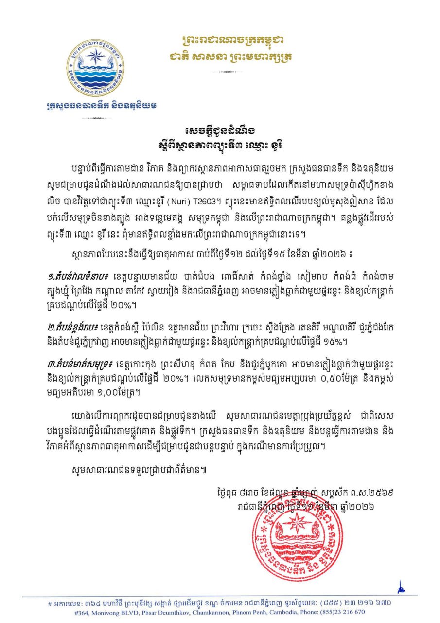 នៅក្នុងសេចក្តីជូនដំណឹងរបស់ក្រសួងធនធានទឹក និងឧតុនិយម ដែលបណ្តាញព័ត៌មាន Fresh News ទទួលបាននៅថ្ងៃទី១១ ខែមីនា ឆ្នាំ២០២៦នេះ បានបញ្ជាក់ឱ្យដឹងថា បន្ទាប់ពីធ្វើការតាមដាន វិភាគ និងព្យាករស្ថានភាពអាកាសធាតុរួចមក ក្រសួងធនធានទឹក សូមជម្រាបជូនដំណឹងដល់សាធារណជនឱ្យបានជ្រាបថា សម្ពាធទាបដែលកើតនៅមហាសមុទ្រប៉ាស៊ីហ្វិកខាង លិច បានវិវត្តទៅជាព្យុះទី៣ ឈ្មោះនូរី (Nuri) T2603។ ព្យុះនេះមានឥទ្ធិពលលើរបបខ្យល់មូសុងឦសាន ដែលបក់លើសមុទ្រចិនខាងត្បូង អាងទន្លេមេគង្គ សមុទ្រកម្ពុជា និងលើព្រះរាជាណាចក្រកម្ពុជា។ គន្លងផ្លូវដើររបស់ ព្យុះទី៣ ឈ្មោះ នូវី នេះ ពុំមានឥទ្ធិពលខ្លាំងមកលើព្រះរាជាណាចក្រកម្ពុជានោះទេ។