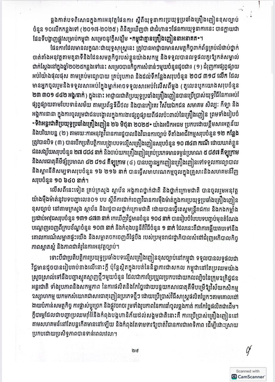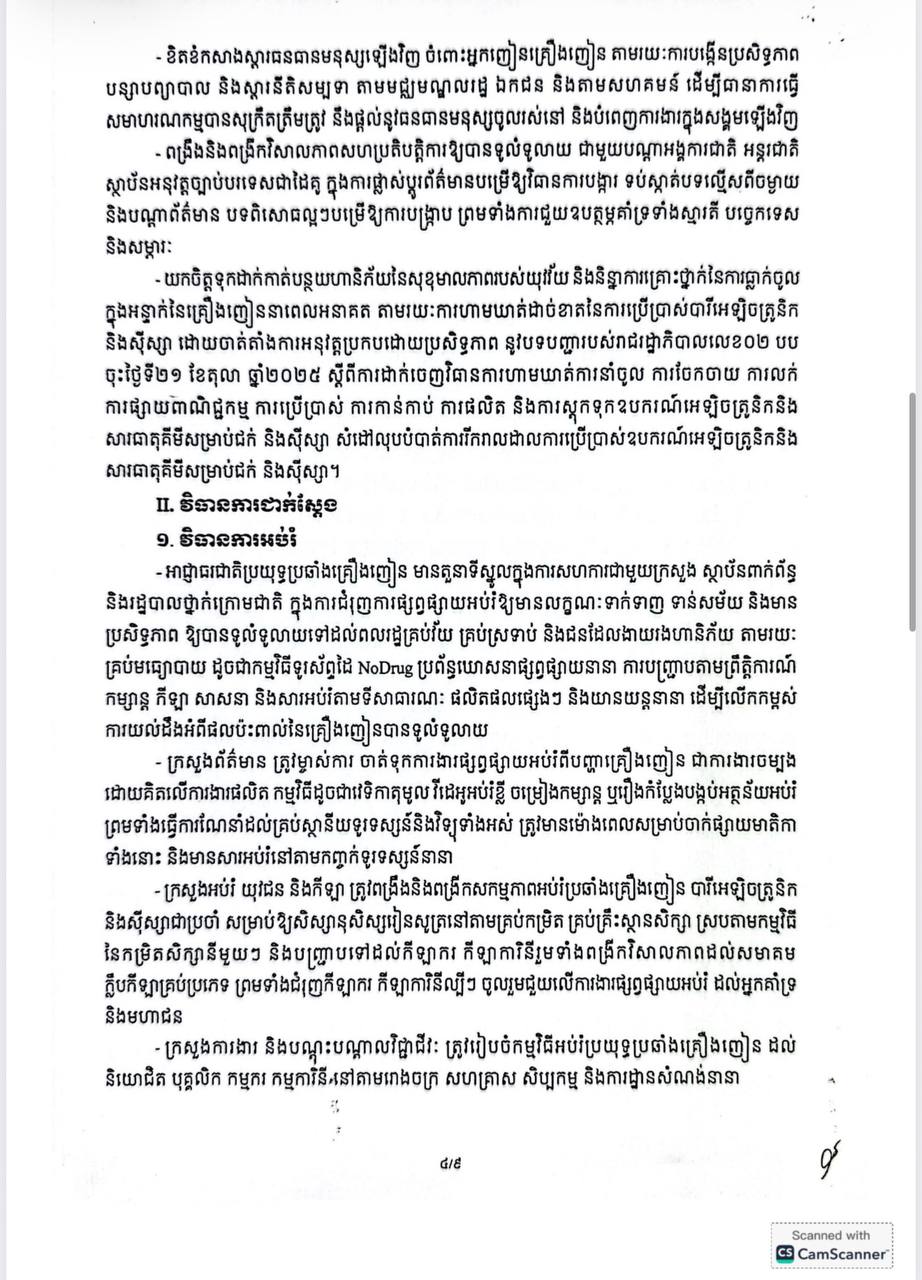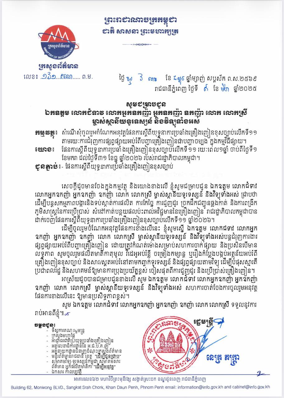 រដ្ឋមន្ត្រីក្រសួងព័ត៌មាន ស្នើម្ចាស់ស្ថានីយទូរទស្សន៍ និងវិទ្យុបន្តជំរុញការផ្សព្វផ្សាយអប់រំពីបញ្ហាគ្រឿងញៀន ដោយត្រូវកំណត់ម៉ោងសម្រាប់សហការចាក់ផ្សាយ និងប្រសិនបើមានលទ្ធភាព