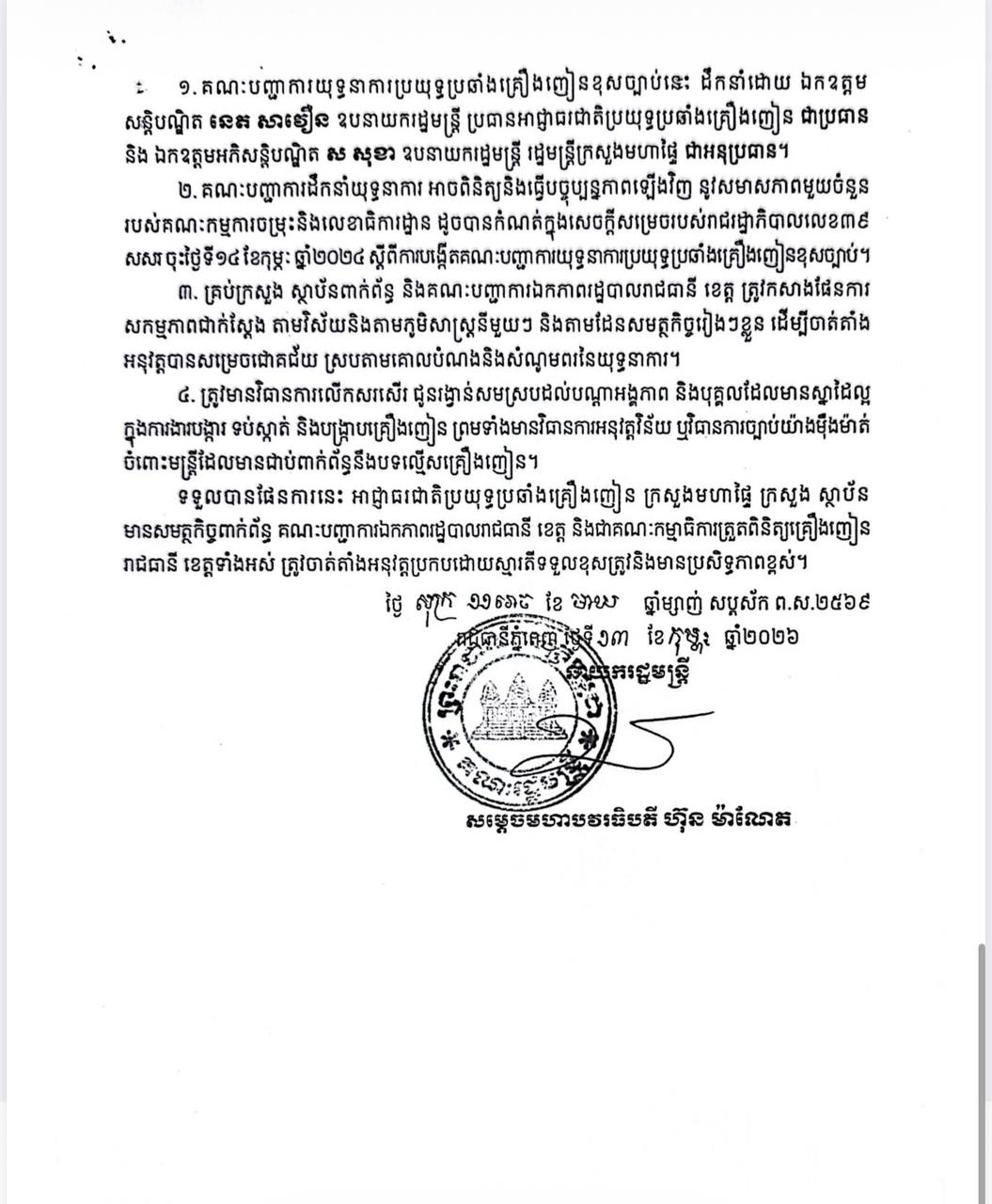 តាមរយៈលិខិតរដ្ឋមន្ត្រី នេត្រ ភក្ត្រា បានលើកឡើងថា៖ «ដើម្បីចូលរួមចំណែកអនុវត្តផែនការខាងលើនេះ ខ្ញុំសូមស្នើឯកឧត្តម លោកជំទាវ លោកអ្នក ឧកញ៉ា អ្នកឧកញ៉ា ឧកញ៉ា លោក លោកស្រី ម្ចាស់ស្ថានីយទូរទស្សន៍ និងវិទ្យុទាំងអស់បន្តជំរុញការងារផ្សព្វផ្សាយអប់រំពីបញ្ហាគ្រឿងញៀន ដោយត្រូវកំណត់ម៉ោងសម្រាប់សហការចាក់ផ្សាយ និងប្រសិនបើមានលទ្ធភាព សូមចូលរួមផលិតមាតិកាតុមូល វីដេអូអប់រំខ្លី ចម្រៀងកម្សាន្ត ឬរឿងកំប្លែងបង្កប់អត្ថន័យអប់រំពី គ្រឿងញៀនខុសច្បាប់ និងសារ/ស្ថិតអប់រំនៅតាមកញ្ចក់ទូរទស្សន៍ និងផ្សព្វផ្សាយតាមវិទ្យុ ដើម្បីបំផុសស្មារតីប្រជាពលរដ្ឋ និងសហគមន៍ឱ្យមានការប្រុងប្រយ័ត្នខ្ពស់ចៀសផុតពីការជួញដូរ និងប្រើប្រាស់គ្រឿងញៀន»៕