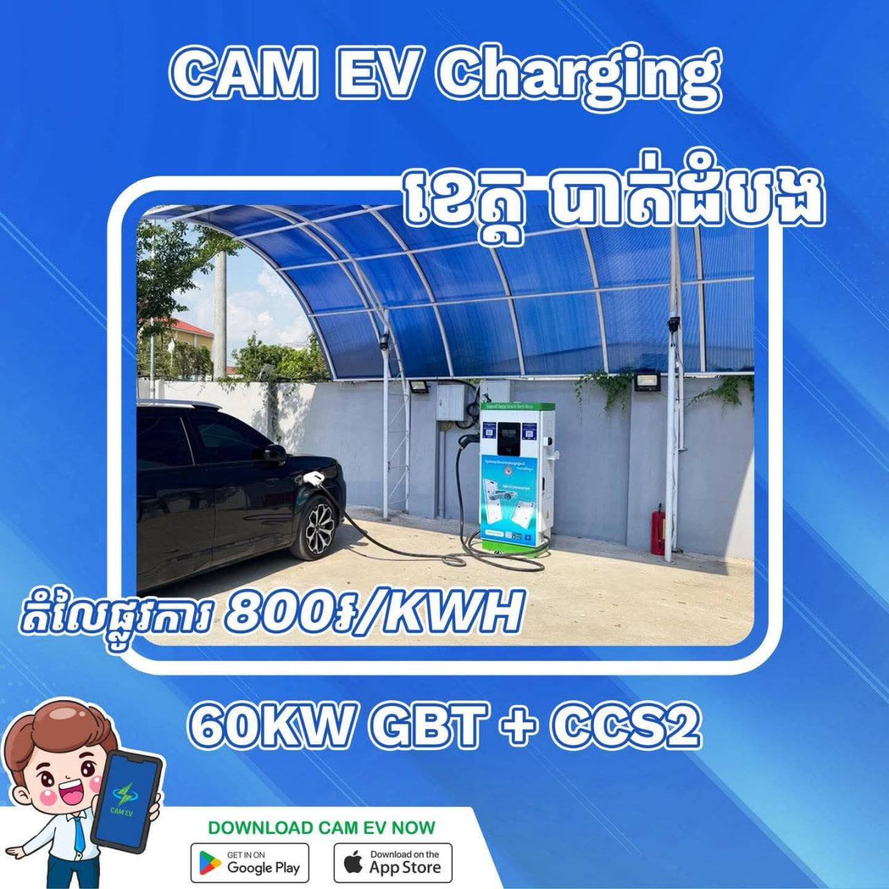 ទី១៖ ស្ថានីយសាករថយន្ត EV ខេត្តបាត់ដំបង (Fast Charge 60KW GBT + CCS2) ត្រូវប្រើ App CAM EV ទីតាំងស្ថិតនៅភូមិរំចេក៣ សង្កាត់រតនះ ក្រុងបាត់ដំបង។