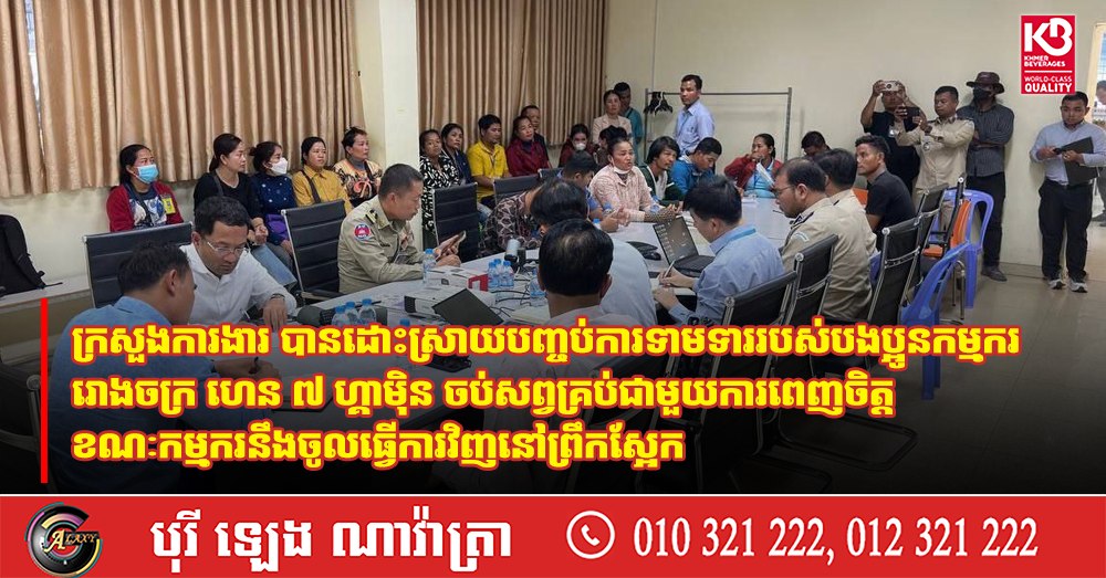 ក្រសួងការងារ បានដោះស្រាយបញ្ចប់ការទាមទាររបស់បងប្អូនកម្មកររោងចក្រ ហេន ៧ ហ្គាម៉ិន ចប់សព្វគ្រប់ជាមួយការពេញចិត្ត ខណៈកម្មករនឹងចូលធ្វើការវិញនៅព្រឹកស្អែក