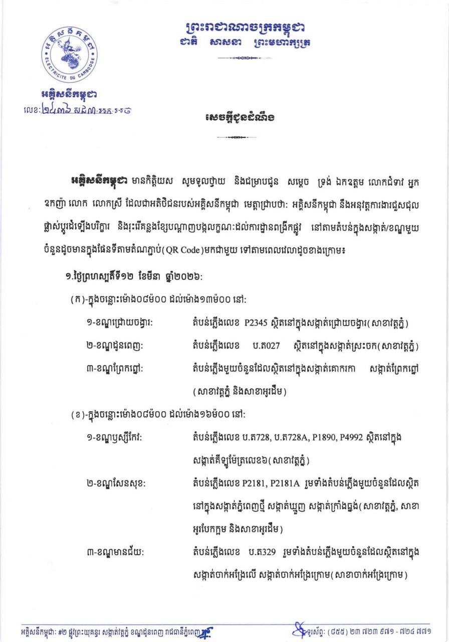 (ភ្នំពេញ)៖ អគ្គិសនីកម្ពុជា (EDC) បានចេញសេចក្តីជូនដំណឹង ស្តីពីការអនុវត្តការងារជួសជុល ផ្លាស់ប្តូរដំឡើងបរិក្ខារនានា និងរុះរើគន្លងខ្សែបណ្តាញ អគ្គិសនីរបស់អគ្គិសនីកម្ពុជា ដើម្បីបង្កលក្ខណៈងាយស្រួលដល់ការដ្ឋានពង្រីកផ្លូវ នៅថ្ងៃទី១២ ខែមីនា ឆ្នាំ២០២៦ ដល់ថ្ងៃទី១៥ ខែមីនា ឆ្នាំ២០២៦ នៅតំបន់មួយចំនួនទៅតាមពេលវេលា និងទីកន្លែងដូចសេចក្តីជូនដំណឹងលម្អិតខាងក្រោម។