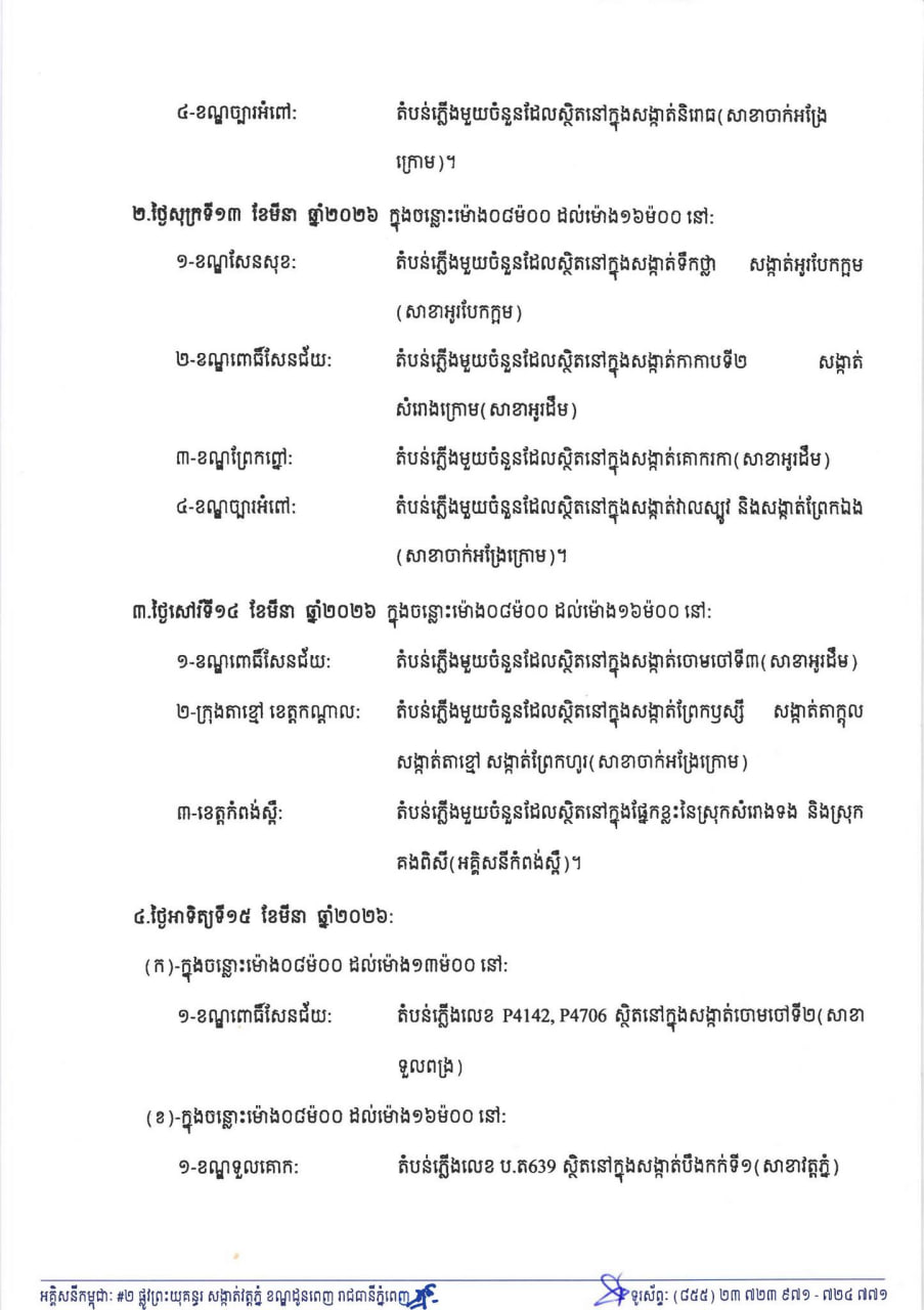 EDC ជូនដំណឹងពីការរអាក់រអួលចរន្ត តាមតំបន់សង្កាត់ខណ្ឌមួយចំនួនចាប់ពីថ្ងៃនេះដល់ថ្ងៃទី១៥ ខែមីនា ដើម្បីរុះរើគន្លងខ្សែបណ្តាញ ផ្លាស់ប្តូរ តម្លើងបរិក្ខារ ងាយស្រួលដល់ការដ្ឋានពង្រីកផ្លូវ