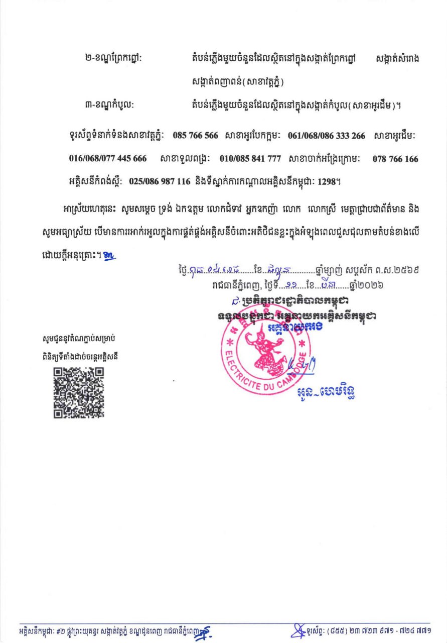 សូមអានសេចក្តីជូនដំណឹង របស់អគ្គិសនីកម្ពុជា ដូចខាងក្រោម ៖