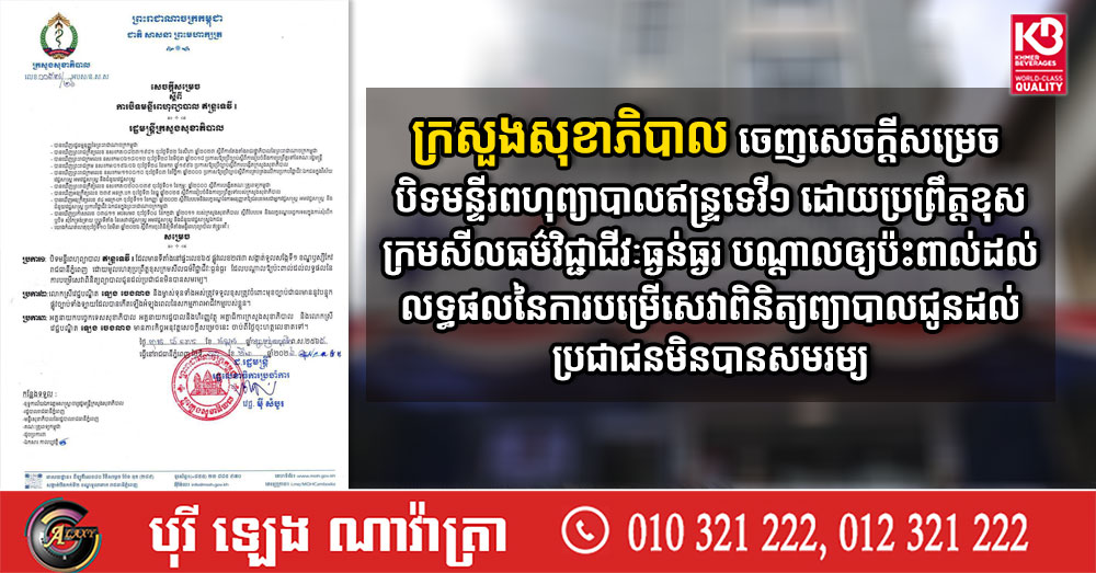 ក្រសួងសុខាភិបាល ចេញសេចក្តីសម្រេច បិទមន្ទីរពហុព្យាបាលឥន្រ្ទទេវី១ ដោយប្រព្រឹត្តខុសក្រមសីលធម៌វិជ្ជាជីវៈធ្ងន់ធ្ងរ បណ្ដាលឲ្យប៉ះពាល់ដល់លទ្ធផលនៃការបម្រើសេវាពិនិត្យព្យាបាលជូនដល់ប្រជាជនមិនបានសមរម្យ