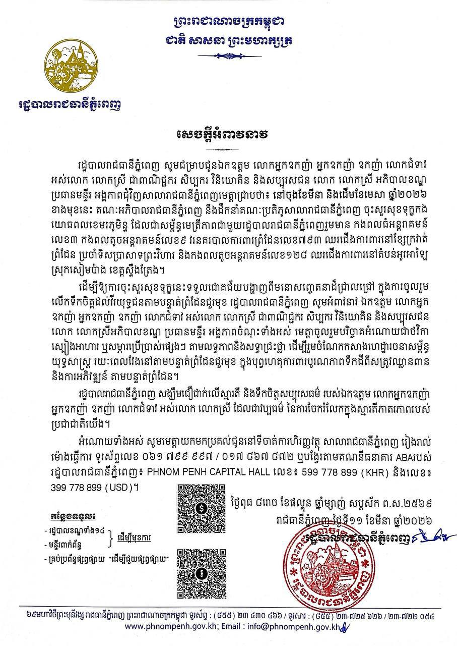 រដ្ឋបាលរាជធានីភ្នំពេញ អំពាវនាវសប្បុរសជនបរិច្ចាគធនធាន ដើម្បីចុះសួរសុខទុក្ខកងកម្លាំងជួរមុខ ក្នុងឱកាសចូលឆ្នាំខ្មែរ