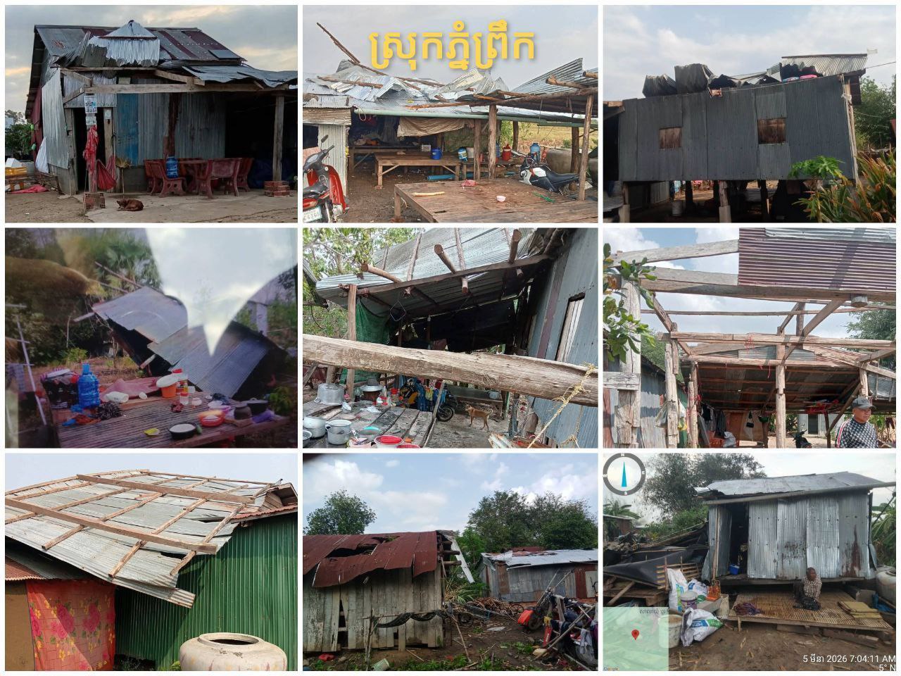 (បាត់ដំបង)៖ ក្រុមការងារអនុសាខាកាកបាទក្រហមកម្ពុជាស្រុកភ្នំព្រឹក ដឹកនាំដោយលោក សុង សុភ័ក្រ អភិបាលស្រុក និង ជាប្រធានគណៈកម្មាធិការអនុសាខា ព្រមទាំងសហការី នៅថ្ងៃទី១២ ខែមីនា ឆ្នាំ២០២៦ បានអញ្ចើញជួបសំណេះសំណាល សួរសុខទុក្ខ និងនាំយកអំណោយមនុស្សធម៌របស់សប្បុរសជនតាមរយៈអនុសាខាកាកបាទក្រហមកម្ពុជាស្រុក ផ្តល់ជូនប្រជាពលរដ្ឋរងគ្រោះដោយខ្យល់កន្រ្តាក់បណ្ដាលឲ្យប៉ើង ដំបូលផ្ទះ សរុបចំនួន១៦គ្រួសារ ក្នុងនោះប៉ើងបំបូងទាំងស្រុងចំនួន៦ខ្នងផ្ទះ ,ប៉ើងដំបូលធ្ងន់ធ្ងរចំនួន ៥ខ្នងផ្ទះ,និងដោយអន្លើងចំនួន៦ខ្នងផ្ទះដែលមានទីលំនៅក្នុងភូមិចំនួន៣នៃ ឃុំបួរ ស្រុកភ្នំព្រឹក ខេត្តបាត់ដំបង។