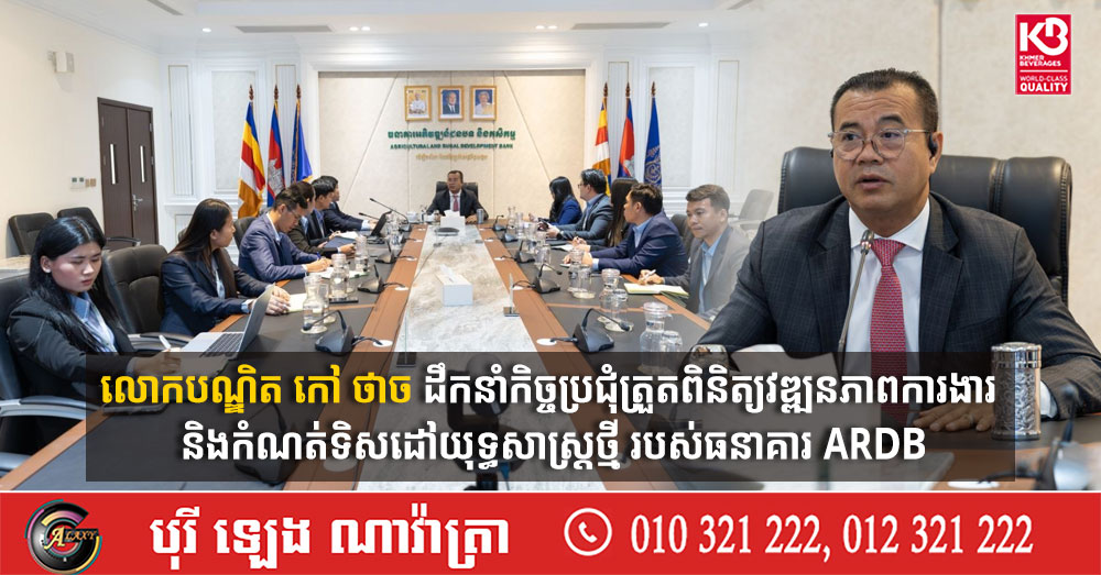 (ភ្នំពេញ)៖ លោកបណ្ឌិត កៅ ថាច ប្រតិភូរាជរដ្ឋាភិបាលទទួលបន្ទុក ជាអគ្គនាយកធនាគារអភិវឌ្ឍន៍ជនបទ និងកសិកម្ម (ARDB) នៅថ្ងៃទី១២ ខែមីនា ឆ្នាំ២០២៦នេះ បានអញ្ជើញដឹកនាំកិច្ចប្រជុំបូកសរុបលទ្ធផលការងារប្រចាំខែ និងលើកទិសដៅការងារបន្ត ជាមួយថ្នាក់ដឹកនាំ និងបុគ្គលិកនៃនាយកដ្ឋានគ្រប់គ្រងសាខា និងប្រតិបត្តិការចល័ត ព្រមទាំងបណ្តាសាខាខេត្តទាំងអស់។
