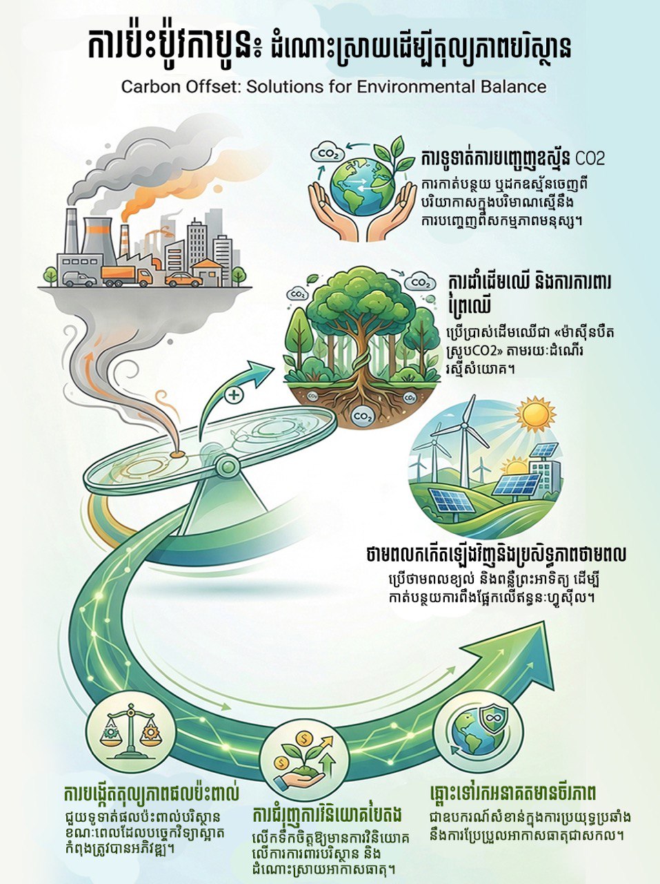 (ភ្នំពេញ)៖ ការប៉ះប៉ូវកាបូន (Carbon Offset) គឺជាយន្តការមួយដែលប្រើដើម្បីទូទាត់ការបញ្ចេញឧស្ម័នកាបូនឌីអុកស៊ីត (CO2) ពីសកម្មភាពមនុស្ស ដោយការកាត់បន្ថយ ឬដកយកឧស្ម័នផ្ទះកញ្ចក់ចេញពីបរិយាកាសនៅកន្លែងផ្សេងទៀតក្នុងបរិមាណស្មើគ្នា។