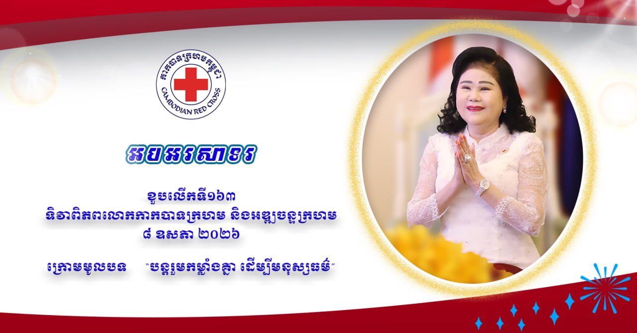 សម្តេចកិត្តិព្រឹទ្ធបណ្ឌិត ប៊ុន រ៉ានី ហ៊ុនសែន ប្រធានកាកបាទ ក្រហមកម្ពុជា សូមថ្លែងអំណរគុណយ៉ាងជ្រាលជ្រៅបំផុតចំពោះ ឯកឧត្តមសាស្ត្រាចារ្យ ឈាង រ៉ា រដ្ឋមន្ត្រីក្រសួងសុខាភិបាល និងលោកជំទាវ គីម សុខលាភ ដែលបានឧបត្ថម្ភថវិកាចំនួន ១០,០០០ដុល្លារអាមេរិក ជូនកាកបាទក្រហមកម្ពុជា ក្នុងឳកាសខួបលើកទី១៦៣ ទិវាពិភពលោក កាកបាទក្រហម និងអឌ្ឍចន្ទក្រហម ៨ ឧសភា ឆ្នាំ២០២៦ ក្រោមមូលបទ «បន្តរួមកម្លាំងគ្នា ដើម្បីមនុស្សធម៌»។