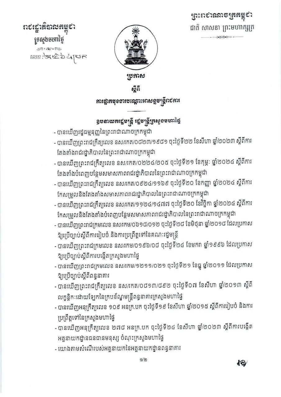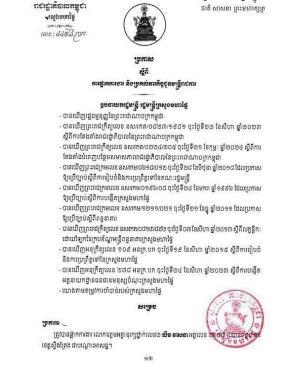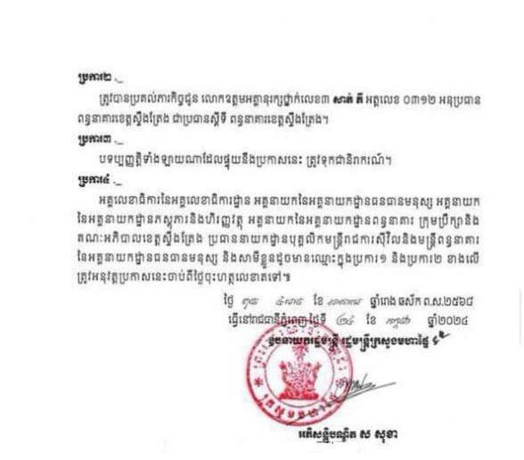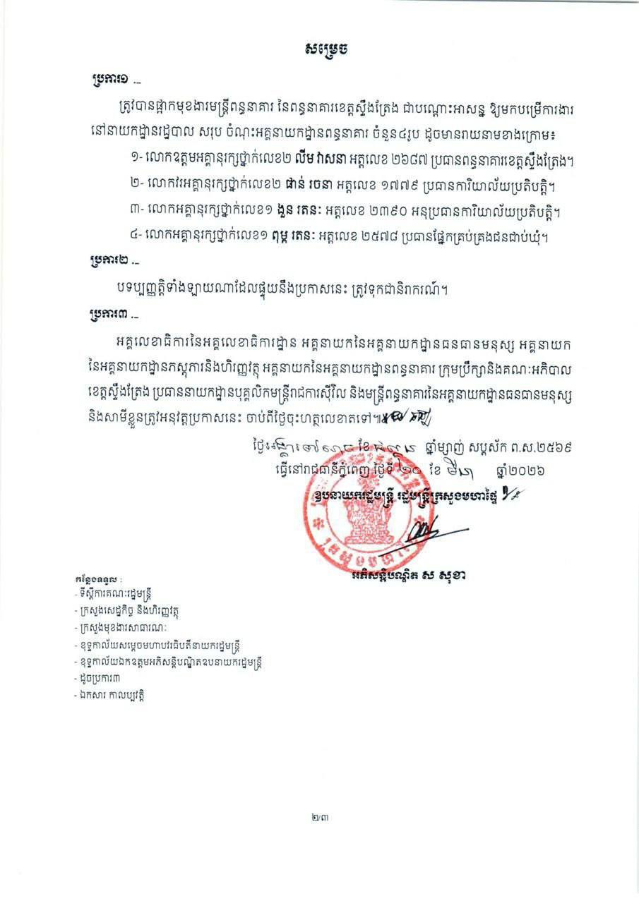 (ភ្នំពេញ)៖ ប្រធានពន្ធនាគារខេត្តស្ទឹងត្រែង លោក លីម វាសនា និងមន្រ្តី៣នាក់ទៀត ត្រូវបានឧបនាយករដ្ឋមន្រ្តី ស សុខា រដ្ឋមន្រ្តីក្រសួងមហាផ្ទៃ សម្រេចផ្អាកការងារ និងមុខងារជាបណ្តោះអាសន្ន។ នេះបើតាមលិខិតសម្រេចរបស់អភិសន្តិបណ្ឌិត ស សុខា ដែលបណ្តាញព័ត៌មាន Fresh News ទទួលបាននៅថ្ងៃទី១៣ ខែមីនា ឆ្នាំ២០២៦។