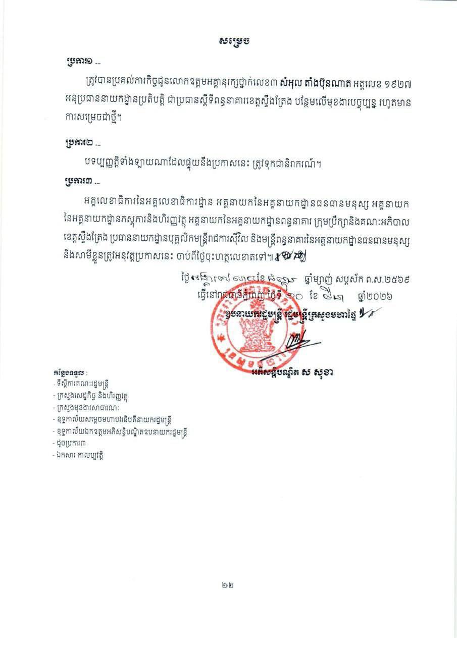 លោក សំអុល តាំងប៊ុនណាត ត្រូវបានតែងតាំងជាប្រធានស្តីទីពន្ធនាគារខេត្តស្ទឹងត្រែង