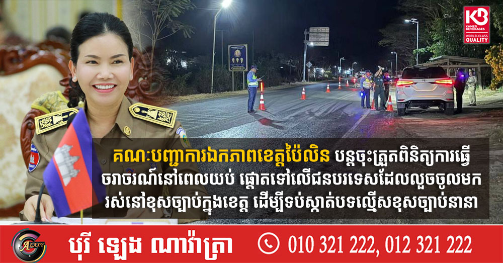 (ប៉ៃលិន)៖ ដោយអនុវត្តតាមបទបញ្ជារបស់លោកស្រីបណ្ឌិត បាន ស្រីមុំ អភិបាលខេត្តប៉ៃលិន និងជាប្រធានគណៈបញ្ជាការឯកភាពខេត្ត នៅយប់ថ្ងៃទី១២ ខែមីនា ឆ្នាំ២០២៦ សមត្ថកិច្ចចម្រុះបានបន្តចុះត្រួតពិនិត្យការធ្វើចរាចរណ៍តាមដងផ្លូវ ដោយផ្តោតទៅលើជនបរទេសដែលចូលមករស់នៅខុសច្បាប់ក្នុងខេត្ត ដើម្បីទប់ស្កាត់បទល្មើសនានា ជាពិសេសទប់ស្កាត់ការលួចបង្កប់បទល្មើសបច្ចេកវិទ្យា (Online Scam) ក្នុងគោលបំណងការពារសន្តិសុខ សណ្តាប់ធ្នាប់ ជូនប្រជាពលរដ្ឋ និងអនុវត្តយ៉ាងម៉ឺងម៉ាត់ចំពោះវិធានការរបស់រាជរដ្ឋាភិបាលកម្ពុជា។