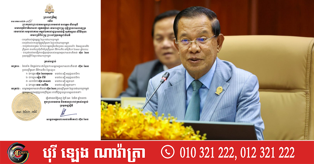(ភ្នំពេញ)៖ ក្នុងព្រះមរបនាម និងតាមព្រះរាជត្រាស់បង្គាប់ព្រះមហាក្សត្រ សម្ដេចតេជោ ហ៊ុន សែន ប្រមុខរដ្ឋស្ដីទី បានចេញព្រះរាជក្រឹត្យត្រាស់បង្គាប់តែងតាំង និងផ្ដល់ឋានៈជំនួយការប្រធានព្រឹទ្ធសភាព នីតិកាលទី៥ ចំនួន៤រូប។
