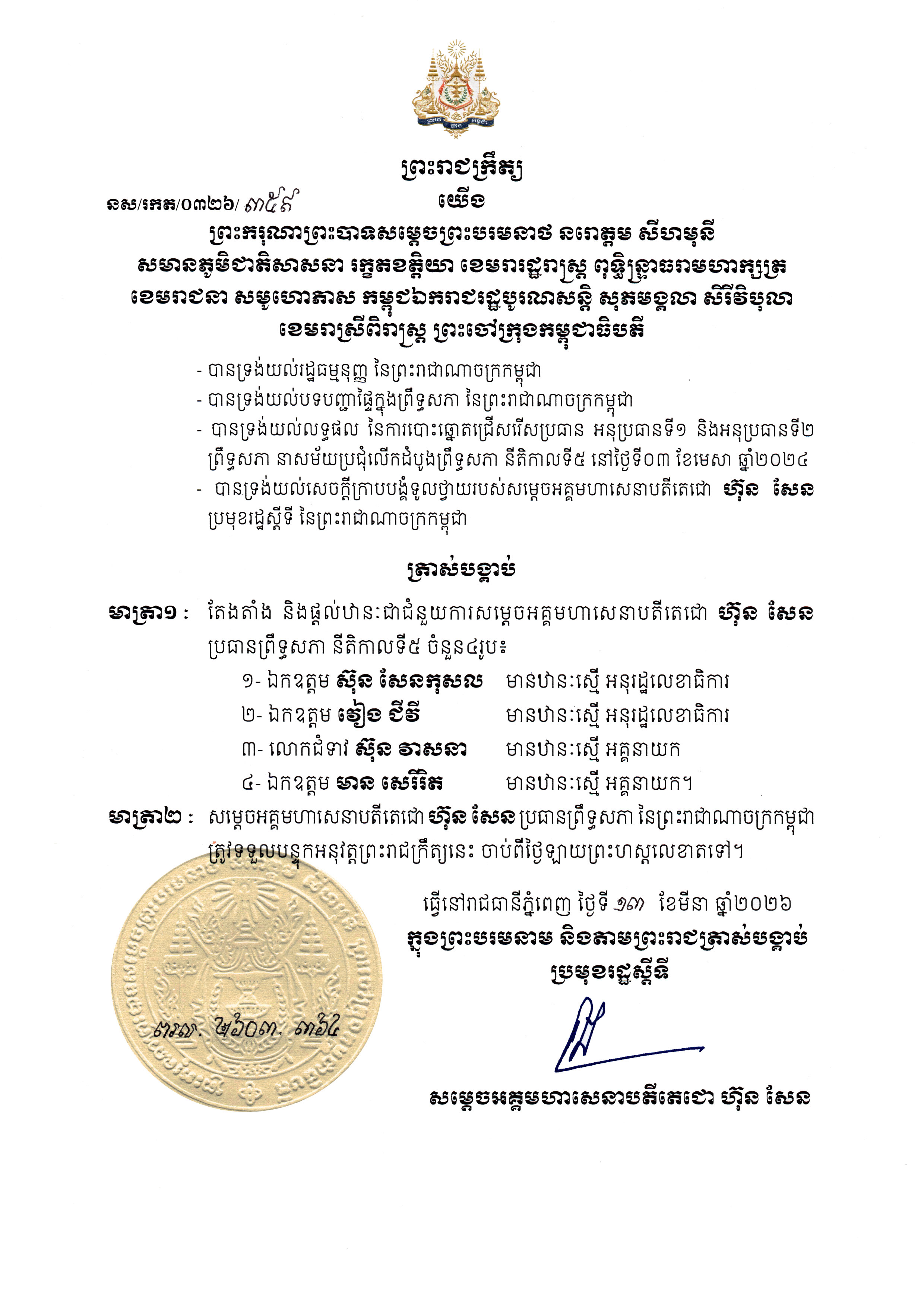 ក្នុងព្រះរាជក្រឹត្យដែលបណ្ដាញព័ត៌មាន Fresh News ទទួលបាននៅថ្ងៃទី១៣ ខែមីនា ឆ្នាំ២០២៦នេះ បានបញ្ជាក់ថា ជំនួយការប្រធានព្រឹទ្ធសភាទាំង៤រូប ដែលទើបទទួលបានការតែងតាំងនេះ មានពីររូប ឋានៈស្មើអនុរដ្ឋលេខាធិការ និងពីររូប ឋានៈស្មើអគ្គនាយក។