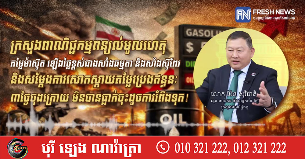 ជាមួយគ្នានេះ ក្រសួងពាណិជ្ជកម្ម បានសម្តែងនូវការសោកស្តាយចំពោះតម្លៃប្រេងឥន្ធនៈ ៣ថ្ងៃចុងក្រោយ មិនបានធ្លាក់ចុះដូចការរំពឹងទុក ព្រោះតែតម្លៃនៅទីផ្សារអន្តរជាតិនៅបន្តកើនខ្ពស់ បើទោះបីមានព័ត៌មានល្អៗអំពីប្រេងឥន្ធនៈក្តី៕
