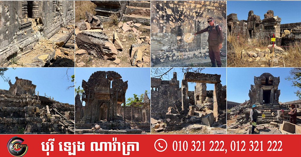 រូបភាពប្រាសាទព្រះវិហារ រងការខូចខាតយ៉ាងធ្ងន់ធ្ងរបណ្តាលមកពីយោធាថៃ បាញ់ស្រោចដោយសព្វាវុធធន់ធ្ងន់ក្នុងសង្គ្រាមឈ្លានពានរយៈពេល២១ថ្ងៃ (Photo and video inside)