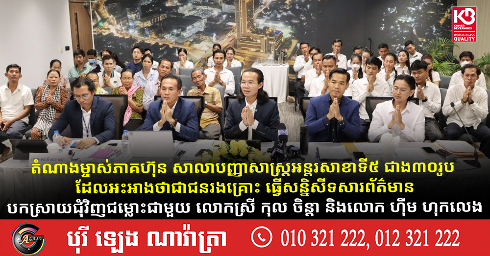 តំណាងម្ចាស់ភាគហ៊ុន សាលាបញ្ញាសាស្ត្រអន្តរសាខាទី៥ ជាង៣០រូប ដែលអះអាងថាជាជនរងគ្រោះ ធ្វើសន្និសីទសារព័ត៌មានបកស្រាយជុំវិញជម្លោះជាមួយ លោកស្រី កុល ចិន្តា និងលោក ហ៊ីម ហុកលេង (Video inside)