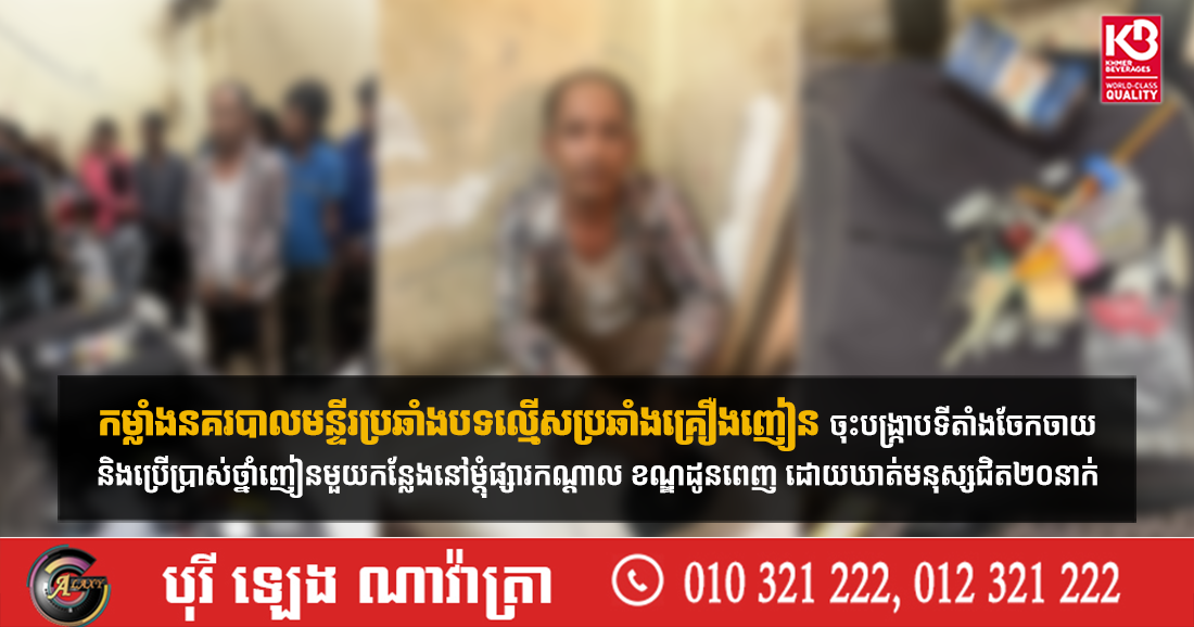 កម្លាំងនគរបាលមន្ទីរប្រឆាំងបទល្មើសប្រឆាំងគ្រឿងញៀន ចុះបង្ក្រាបទីតាំងចែកចាយ និងប្រើប្រាស់ថ្នាំញៀនមួយកន្លែងនៅម្តុំផ្សារកណ្តាល ខណ្ឌដូនពេញ ដោយឃាត់មនុស្សជិត២០នាក់