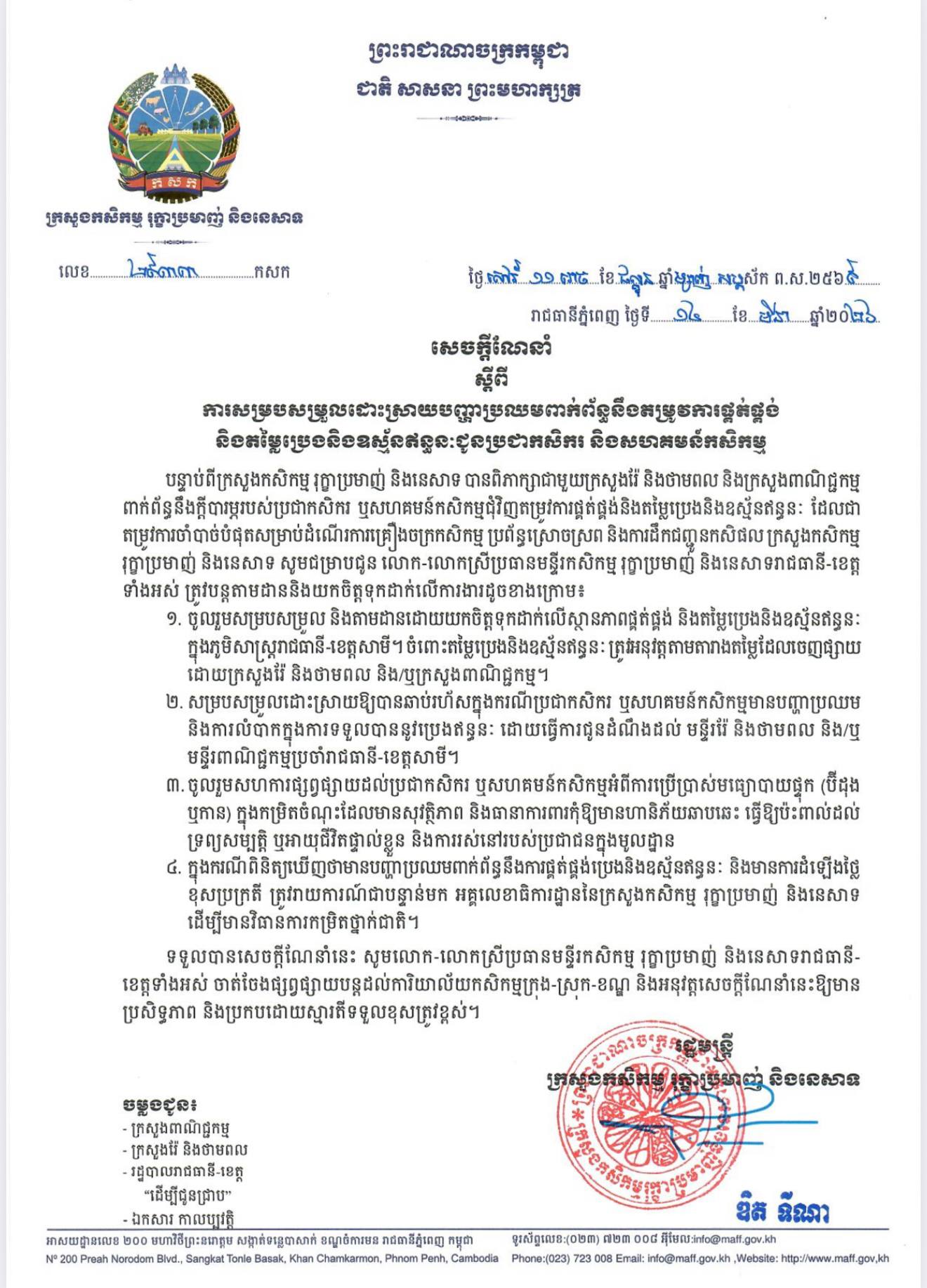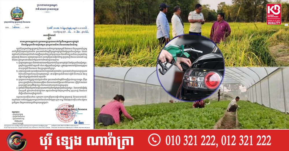 ក្រសួងកសិកម្ម ណែនាំឱ្យគ្រប់មន្ទីរកសិកម្មរាជធានី-ខេត្ត ជួយសម្របសម្រួលដោះស្រាយបញ្ហាប្រឈមពាក់ព័ន្ធនឹងតម្រូវការផ្គត់ផ្គង់ និងតម្លៃប្រេង និងឧស្ម័នឥន្ទនៈជូនប្រជាកសិករ និងសហគមន៍កសិកម្ម
