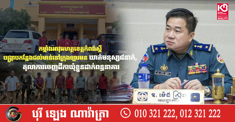 (កំពង់ស្ពឺ)៖ ដោយអនុវត្តតាមបទបញ្ជាយ៉ាង ម៉ឺងម៉ាត់របស់លោកឧត្តមសេនីយ៍ត្រី ម៉េង ស្រ៊ុន មេបញ្ជាការ កងរាជអាវុធហត្ថខេត្តកំពង់ស្ពឺ និងមានការសម្របសម្រួលនីតិវិធីពីព្រះរាជអាជ្ញា អមសាលាដំបូងខេត្តកំពង់ស្ពឺ កាលពីវេលាម៉ោង១៥:១០នាទី នាថ្ងៃទី០៨ ខែមីនា ឆ្នាំ២០២៦ កន្លងមកនេះ កម្លាំងអង្គភាពនគរបាលយុត្តិធម៌ នៃបញ្ជាការដ្ឋានកងរាជអាវុធហត្ថខេត្តកំពង់ស្ពឺ បានធ្វើការបង្រ្កាបជាក់ស្តែង និងឃាត់ខ្លួនជនសង្ស័យចំនួន០៨នាក់ ពាក់ព័ន្ធករណីលេងល្បែងស៊ីសងជល់មាន់ ស្ថិតនៅក្នុងភូមិខោប សង្កាត់រការធំ ក្រុងច្បារមន ខេត្តកំពង់ស្ពឺ។