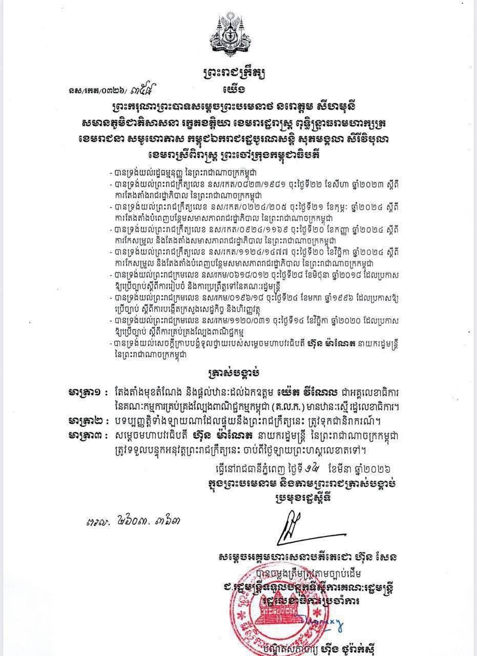 ប្រមុខរដ្ឋស្តីទី ចេញព្រះរាជក្រឹត្យតែងតំាងមុខតំណែង និងផ្តល់ឋានៈដល់លោក យ៉េត វីណែល ជាអគ្គលេខាធិការ នៃអគ្គលេខាធិការដ្ឋាន គ្រប់គ្រងល្បែងពាណិជ្ជកម្មកម្ពុជា មានឋានៈស្មើ រដ្ឋលេខាធិការ