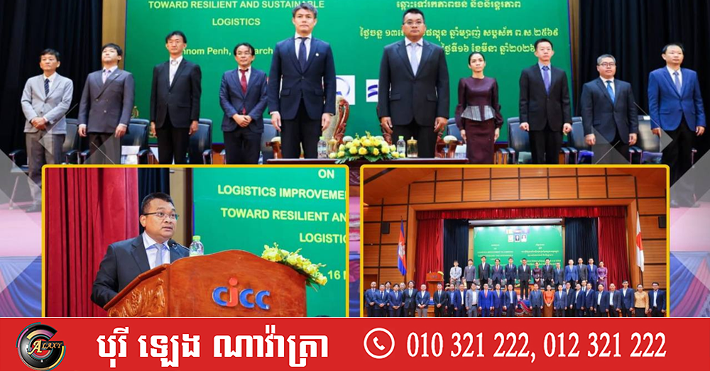 (ភ្នំពេញ)៖ លោក ប៉េង ពោធិ៍នា រដ្ឋមន្រ្តីក្រសួងសាធារណការ និងដឹកជញ្ជូន នាព្រឹកថ្ងៃទី១៦ ខែមីនា ឆ្នាំ២០២៦ នេះ បានអញ្ជើញជាអធិបតីក្នុងពិធីបើកសិក្ខាសាលាស្តីពីការធ្វើឱ្យប្រសើរឡើងនូវប្រព័ន្ធភស្តុភារកម្មកម្ពុជា ឆ្ពោះទៅរកភាពធន និងនិរន្តរភាព ដោយមានការចូលរួមពីលោក SANUI Kazumasa ប្រធានទីភ្នាក់ងារសហប្រតិបត្តិការអន្តរជាតិនៃប្រទេសជប៉ុនប្រចាំនៅកម្ពុជា (JICA) លោក លោកស្រី ថ្នាក់ដឹកនាំក្រសួង តំណាងស្ថានទូតជប៉ុនប្រចាំនៅកម្ពុជា សាស្ត្រាចារ្យមកពីវិទ្យាស្ថានវិទ្យាសាស្ត្រតូក្យូ ប្រទេសជប៉ុន ក្រសួងស្ថាប័នពាក់ព័ន្ធ និងវិស័យឯកជន ព្រមទាំងវាគ្មិនកិត្តិយសជាច្រើនរូបទៀត។