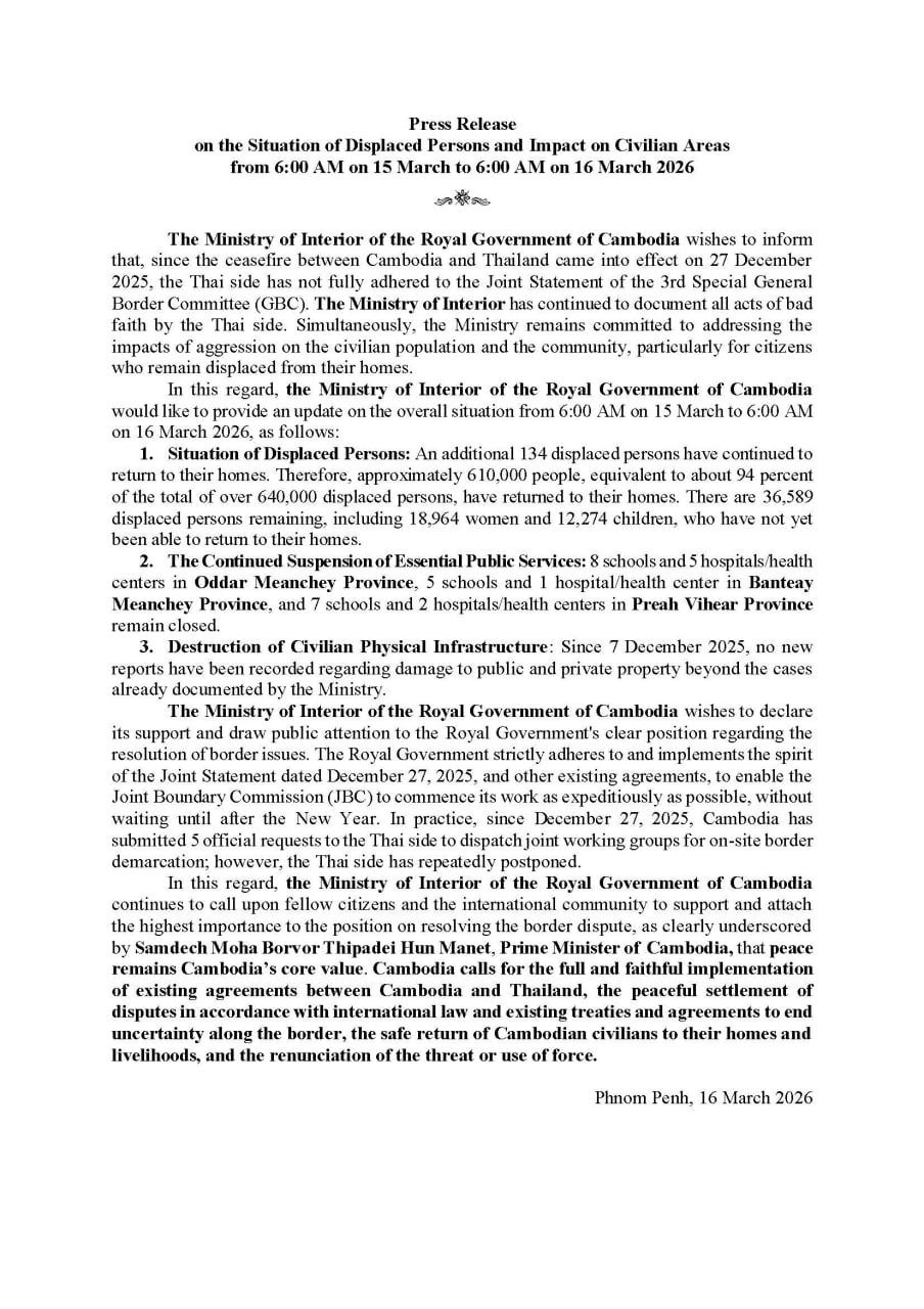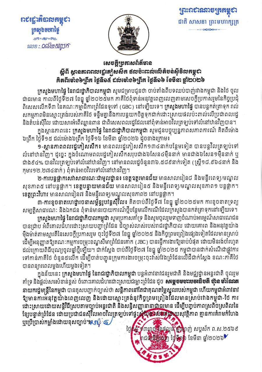 (ភ្នំពេញ)៖ ក្រសួងមហាផ្ទៃ នៅថ្ងៃទី១៦ ខែមីនា ឆ្នាំ២០២៦នេះ បានឲ្យដឹងថា គិតចាប់ពីម៉ោង ៦ព្រឹក ថ្ងៃទី១៥ ដល់ម៉ោង៦ព្រឹក ថ្ងៃទី១៦ ខែមីនា ឆ្នាំ២០២៦នេះ មានប្រជាពលរដ្ឋភៀសសឹក ១៣៤នាក់បន្ថែមទៀត បានវិលត្រឡប់ទៅលំនៅឋានវិញ។ ដូច្នេះក្នុងចំណោមពលរដ្ឋភៀសសឹកសរុបជាង៦សែន ៤ម៉ឺននាក់ មានជាង ៦សែន ១ម៉ឺននាក់ ស្មើ ៩៤ភាគរយ បានវិលត្រឡប់ទៅលំនៅឋានវិញ។